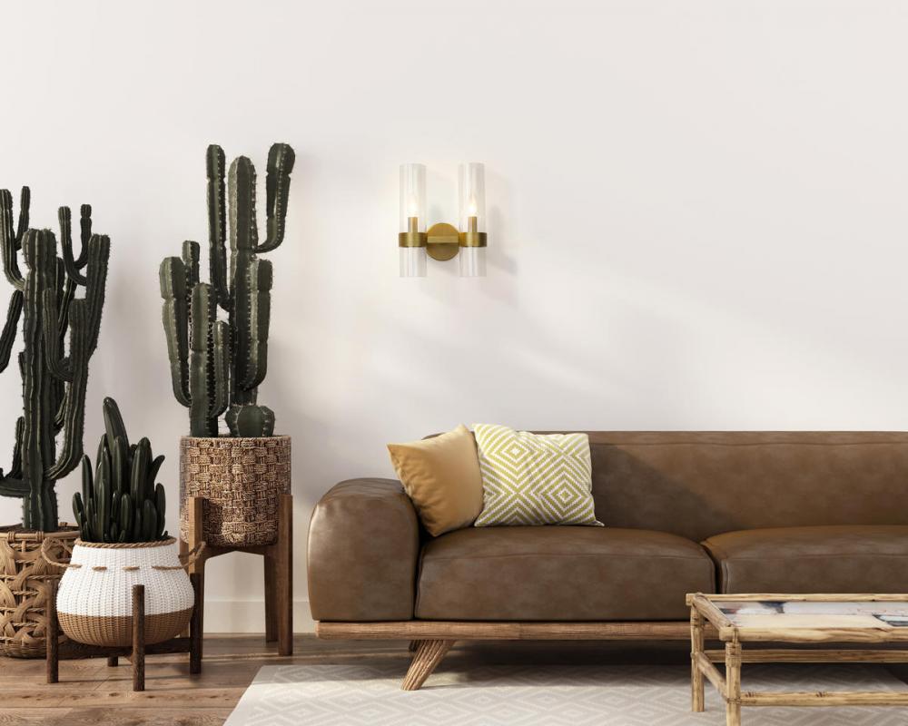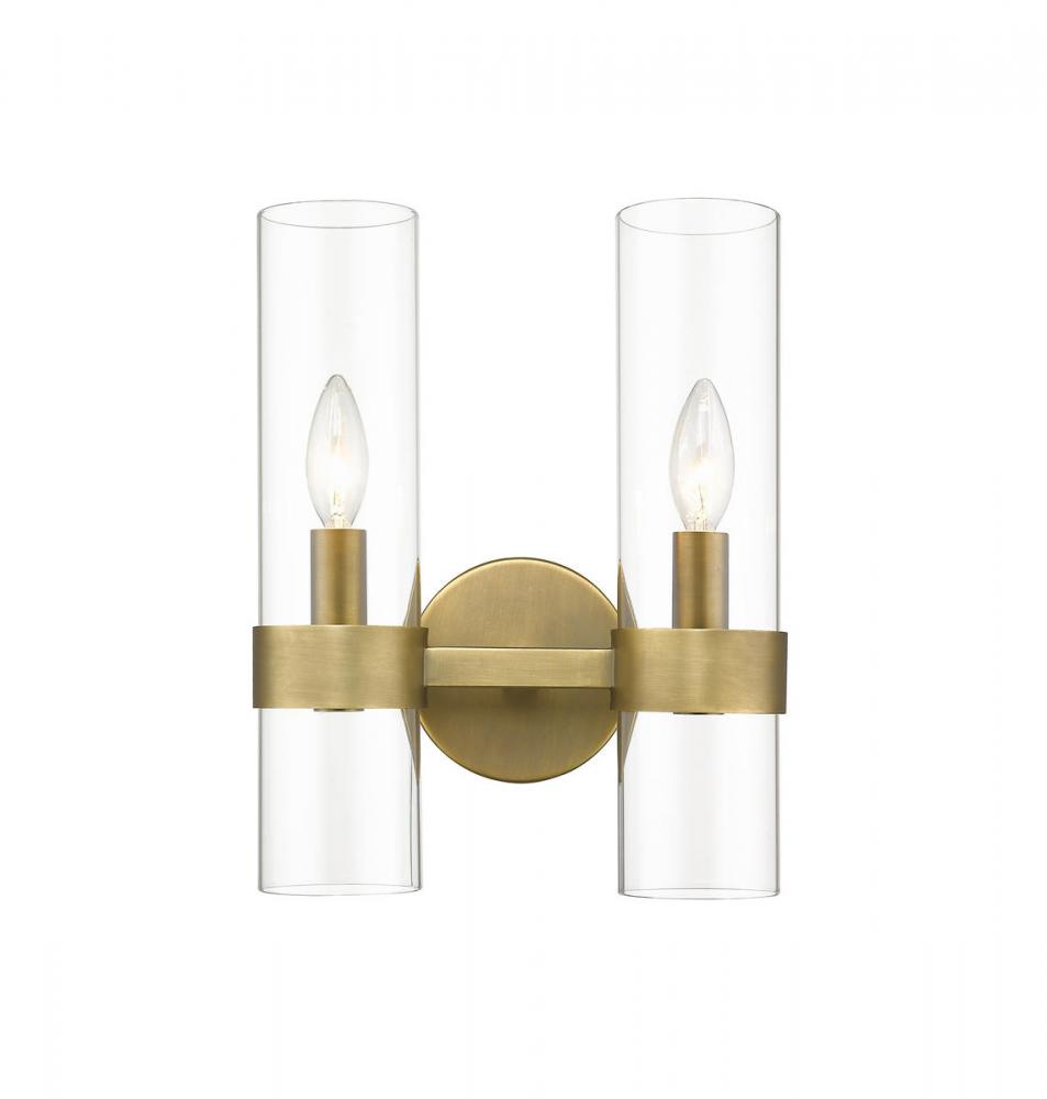 This two-light wall sconce creates a simple yet stylish look in any modern space. Contemporary vibes infuse an easy-living attitude in the Datus rubbed brass two-light sconce, yielding a sleek design featuring slender clear glass cylinder shades mounted to a warm rubbed brass finish solid steel frame. Dress up and illuminate a hallway, bath space, or main living area with this sconce with a minimalist yet impressionable flavor.