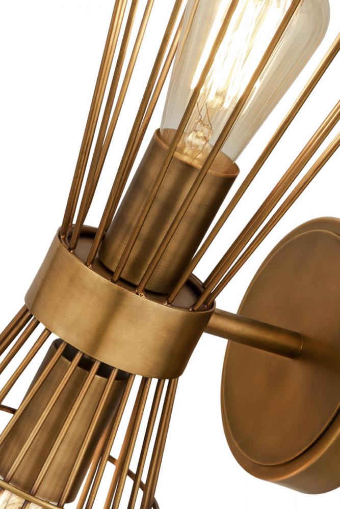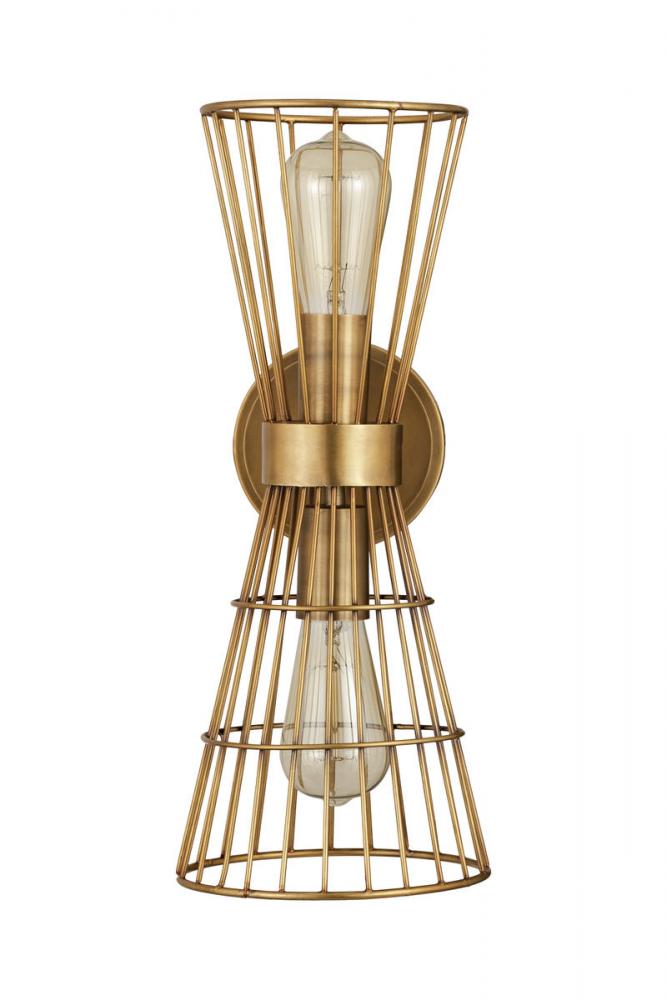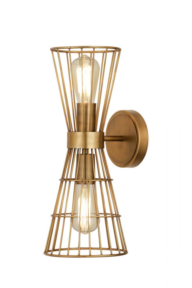 A cage-like design offers a hint of industrial inspiration to this energizing two-light wall sconce, a superb choice for a custom casual space. Light up a hallway, bathroom, or bedroom with this sconce from the Alito collection offering geometric elegance in a concave silhouette and thin wires made of warm rubbed brass finish iron. Adding separately purchased vintage style bulbs changes up its motif to reflect versatility.