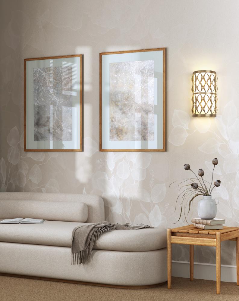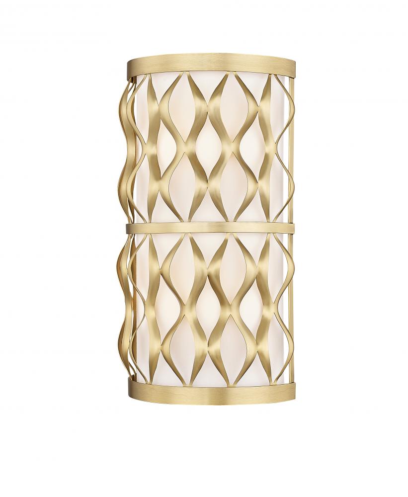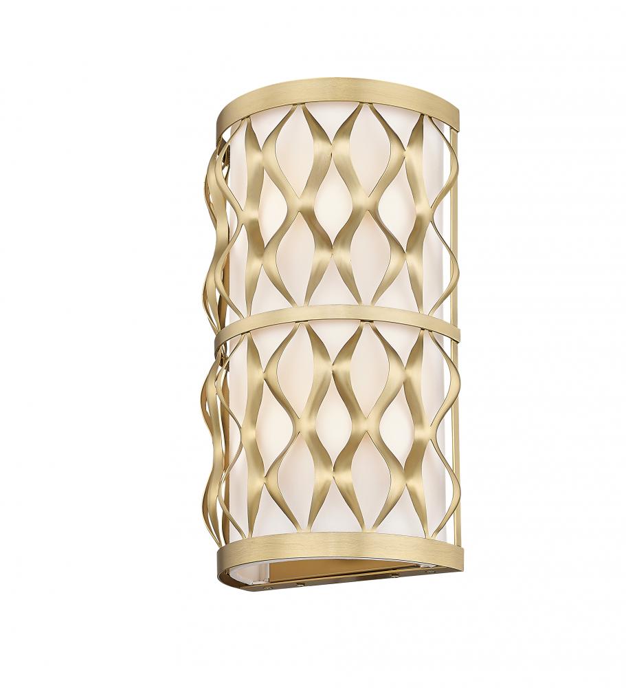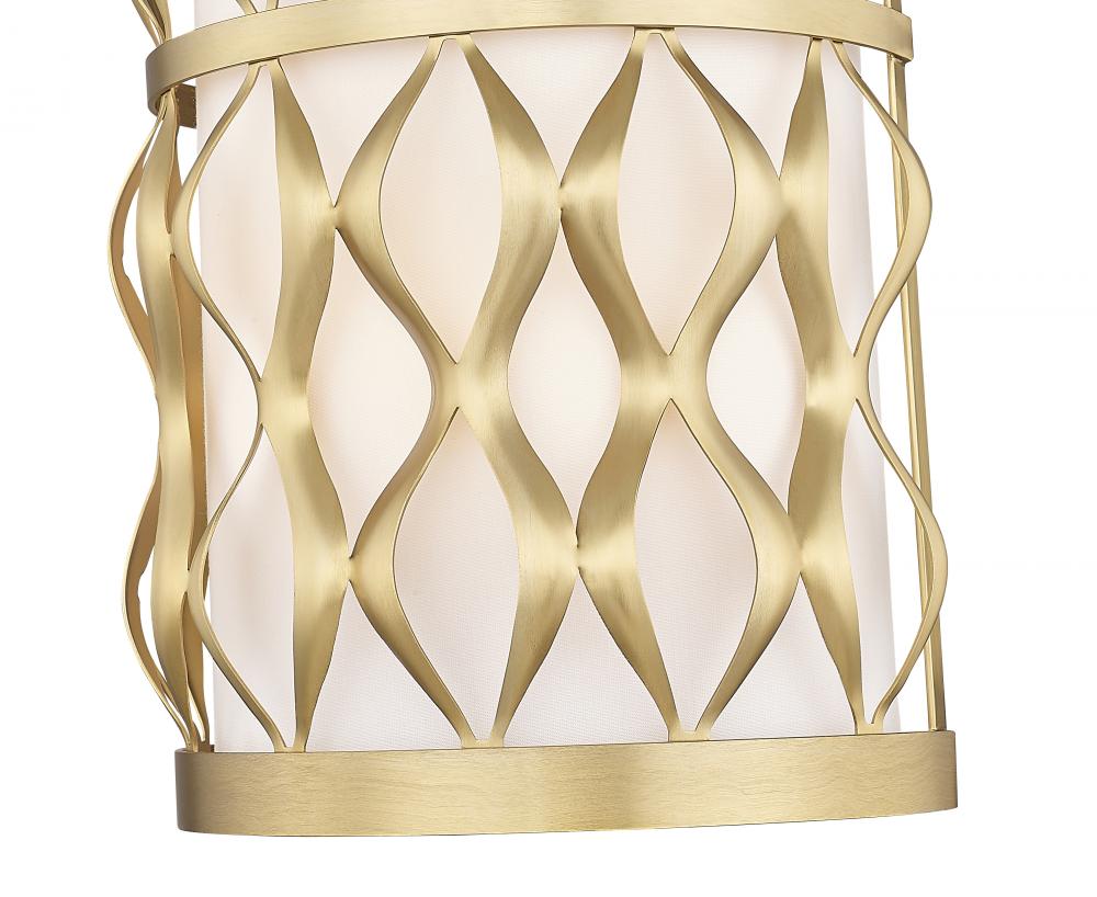 Romantic waves of metal cascade down the cylinder modern gold finish steel frame of this artisan-inspired two-light wall sconce, an excellent choice for lighting up hallways, living spaces, and bedrooms. Candelabra-style lights glow through a white fabric diffuser, a tantalizing contribution to its curvy ribbon accents. Timeless and seamless style add versatility and a theatrical flavor to this elegant wall sconce.