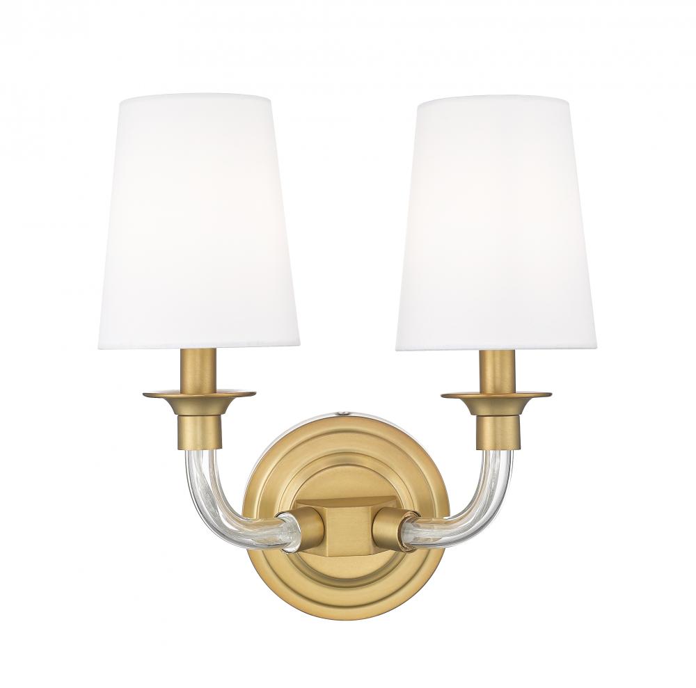 A pair of delicate glass arms and a rich rubbed brass finish create intriguing contrast and dimensionality for this modern two-light wall sconce. Its classic elegance is infused with updated flair, complete with a round wall plate, minimal bobeches and tapered white shades for inviting illumination in your living or dining room.