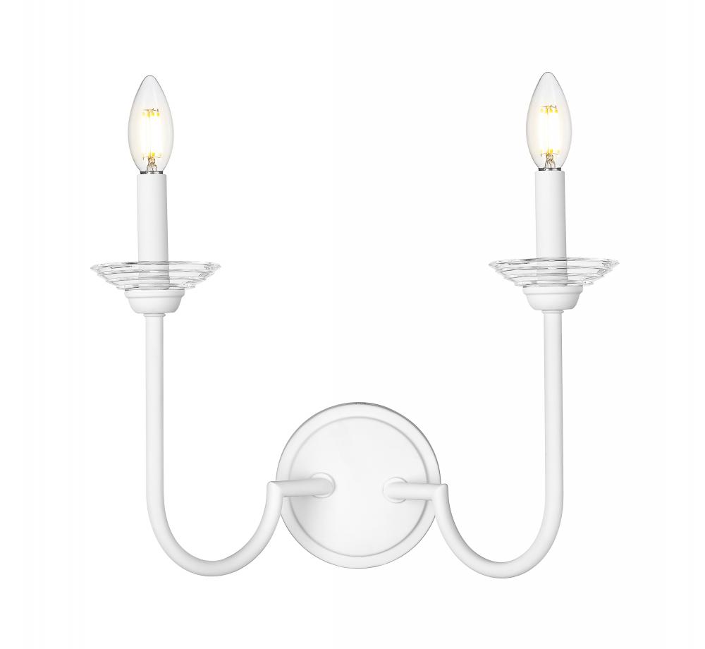 A cool textured white finish lends cottage core flair to this transitional two-light wall sconce from the Allistair collection. Floral bobeches, offered in interchangeable white metal and clear glass, add vintage botanical energy to this charming design, which is right at home in a bath, bedroom, or living area.