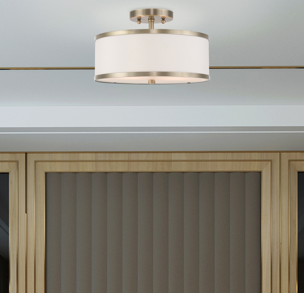 Update Your Decor With This Sleek Semi Flush Mount Design. The Shaded Frame Comes In A Antique Brass Finish Which Nicely Complements The Hand Crafted Off-White Fabric Hardback Shade.