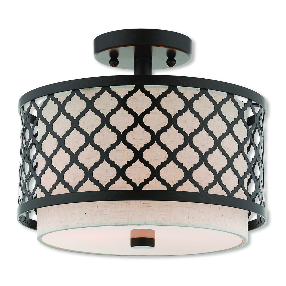 Our Arabesque Two Light Semi Flush Mount Will Add Refined Style And A Hint Of Mystery To Your Decor. The Oatmeal Fabric Hardback Shade Creates A Warm Illumination, While The Light Brings To Life The Intricate English Bronze Cutout Pattern.