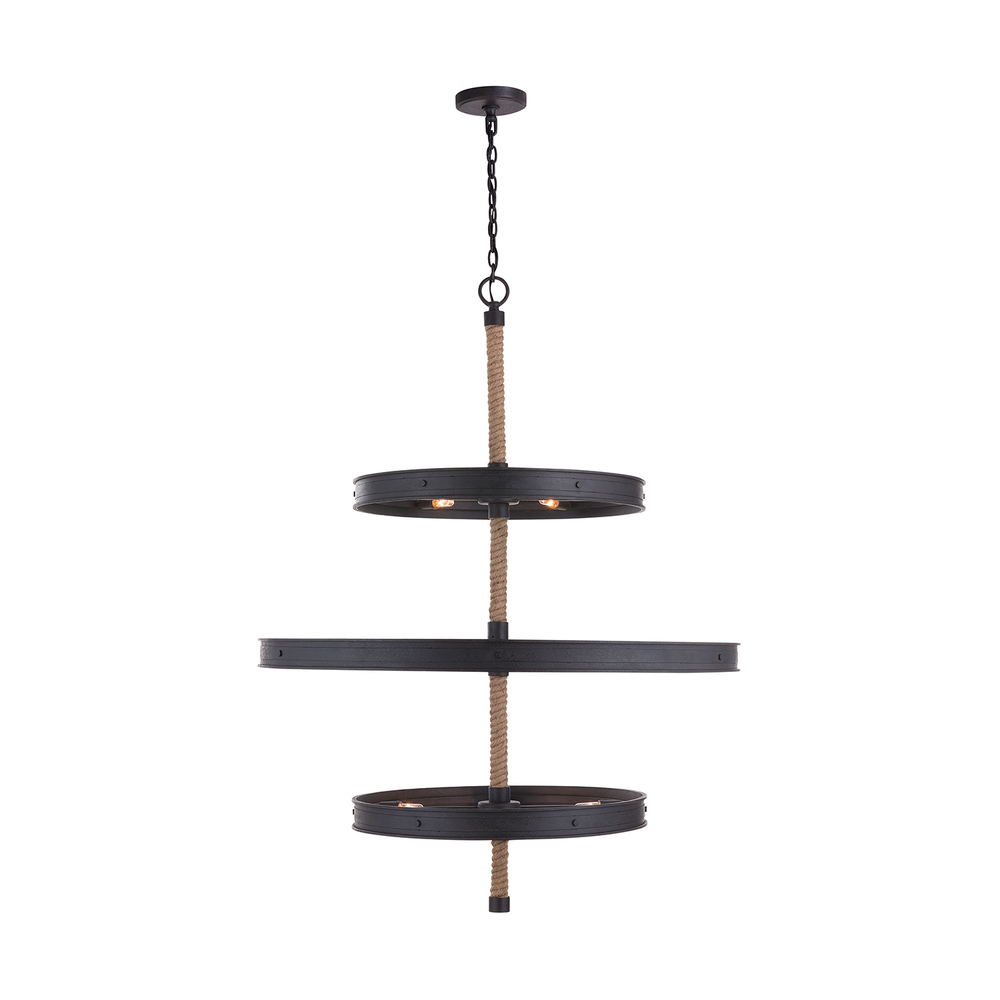 20 light chandelier with Rustic Iron finish. Additional Mounting Support Required (included), natural rope.