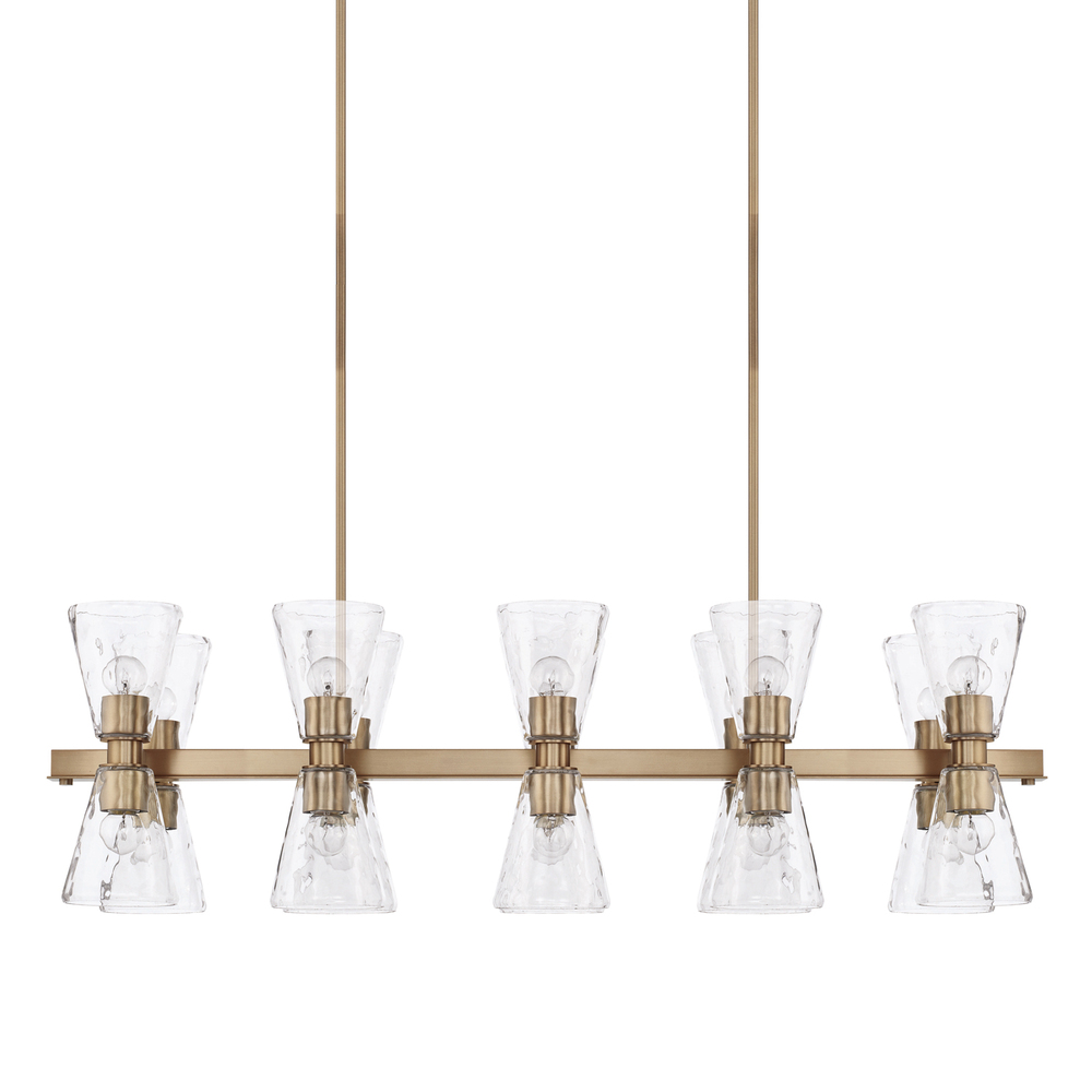 Two rows of double-cone glass shades define the distinct style of the Lyra 20-light island fixture. This wide light fixture is ideal for illuminating a kitchen island or dining table. Bi-directional lamping allows light to pour out below and above, creating plenty of ambient as well as task lighting.