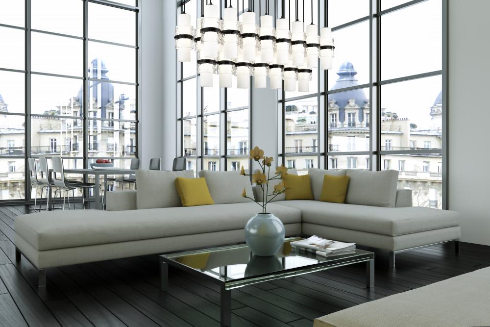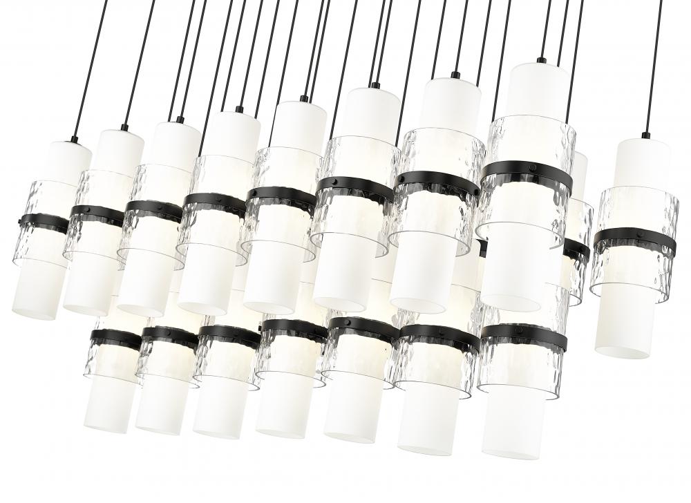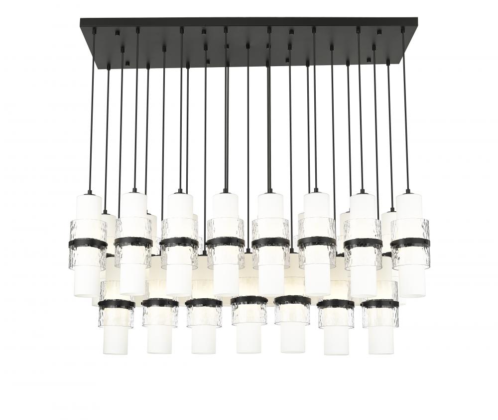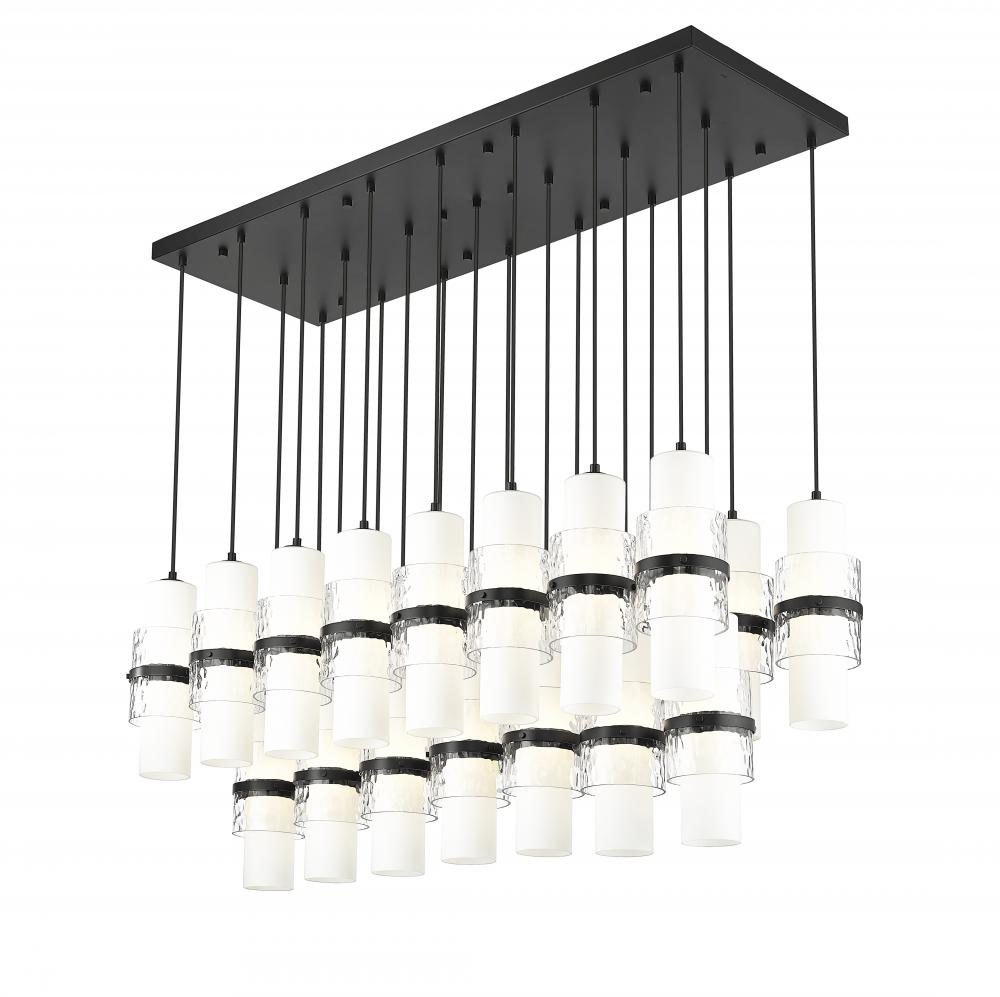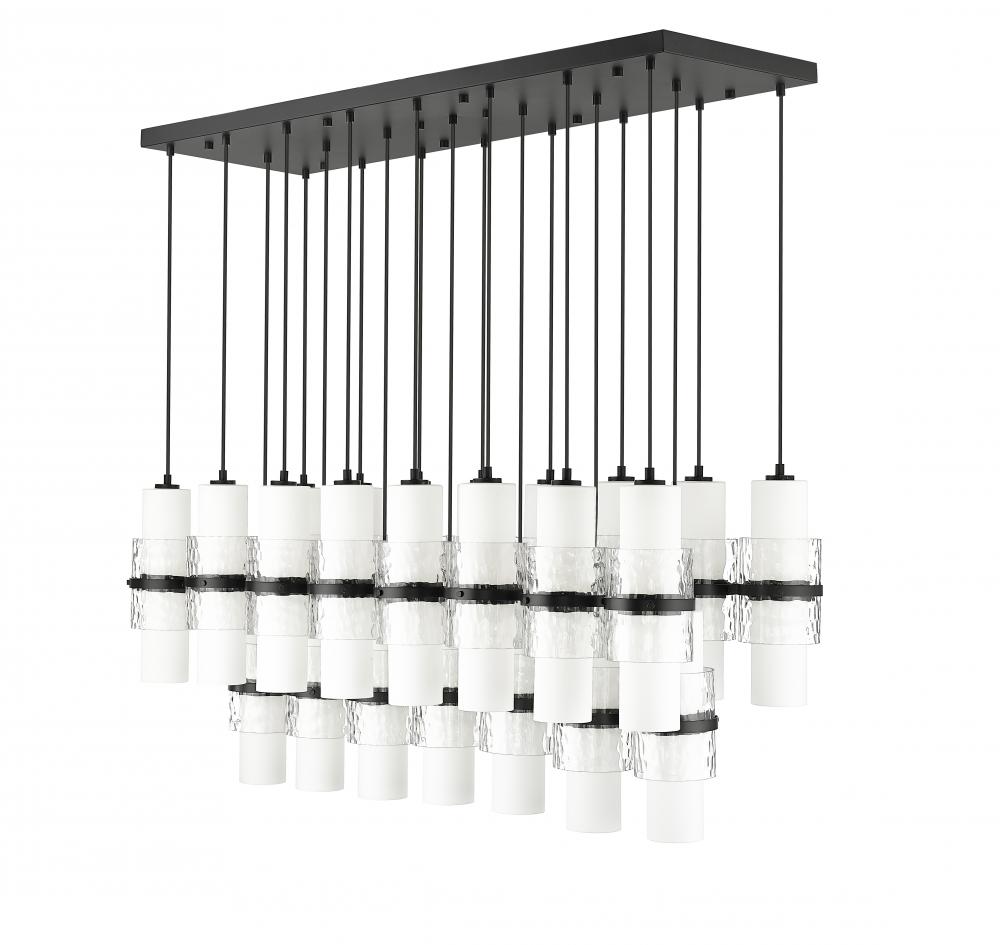 Tiered design and exquisite materials highlight a modern 23-light linear chandelier. Three rows of lights create a spectacular display, each with a layered shade that begins with an etched opal glass cylinder, adds clear textured glass and is secured with a decorative cuff in a rich matte black finish to match its canopy. Braided cloth cord covers complete the look with fresh elegance, perfect for an island pendant in your kitchen or over a dining table.