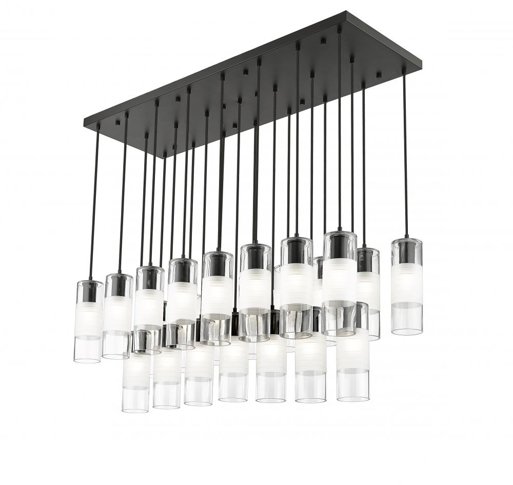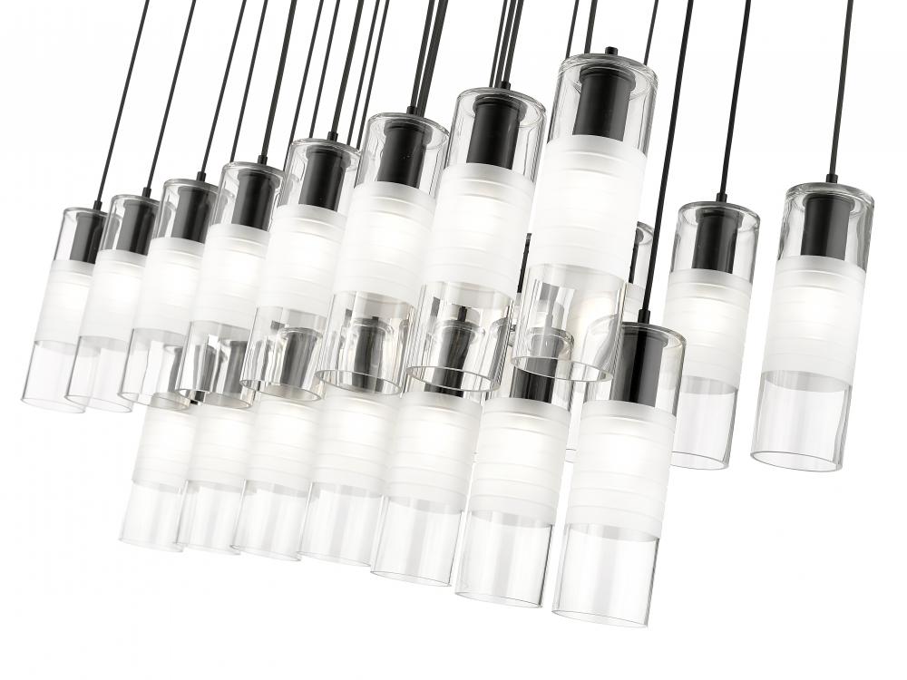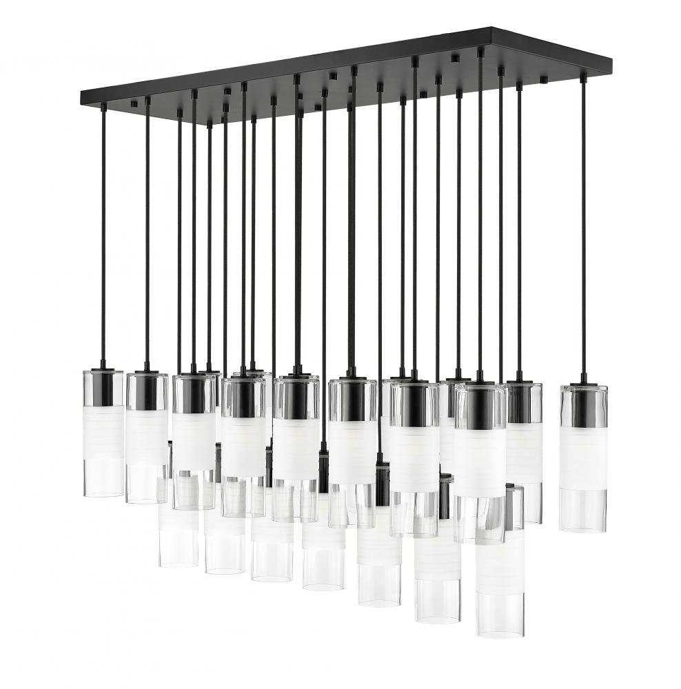 An impressive collection of 23 lights ensures grand scale for a modern linear chandelier from the Alton collection. Matte black finish housings host clear and frosted glass, creating soft, inviting illumination and a sense of substance. Black braided cloth cord covers add a tailored touch, suspending lights in three rows and two tiers to deliver bold, sculptural style over an island, foyer, or dining table.