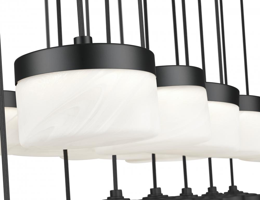 Along its deep inky frame, this matte black 23-light linear LED chandelier lines up glowing glass shades that appear to float in midair across the room. The generous spread of light easily covers long islands, conference tables, or extended dining setups so every seat feels included in the glow.