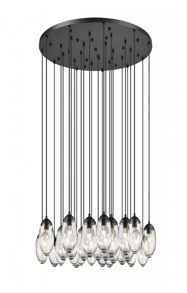 Light reflection plays an enduring role in the design factor of a light fixture with an authentic organic personality. Glam goes a bit easy with this 27-light rounded chandelier representing tempered minimalism as it delivers versatility and artistry. Marvel at the radiance of teardrop glass shades dangling in a circle at graduated lengths from a round matte black finish metal canopy, becoming a focal point in a dining room, living space, or entryway.