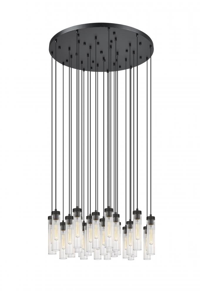 A circle of light casts radiant illumination and a glam-inspired flavor in a modern space as this 27-light round chandelier breathes life into custom living spaces. A cluster of subtly graduated, delicate fluted glass shades dangle from a bold matte black finish round metal canopy and form an example of organic expressive style.