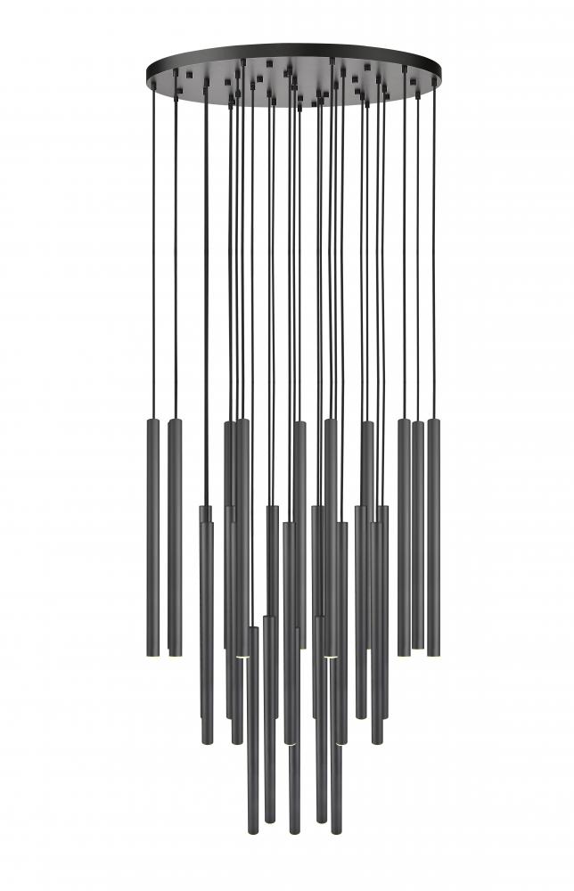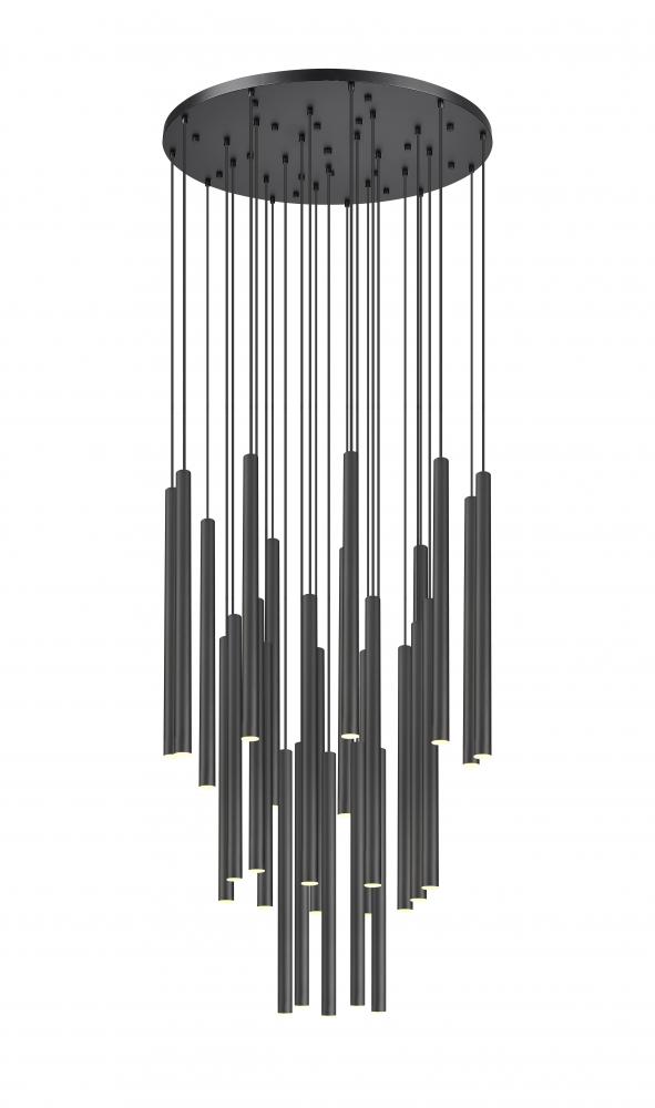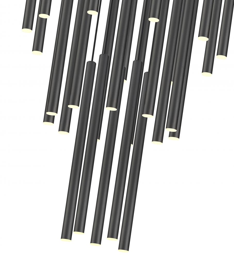 The richness and depth of a matte black finish instantly elevates this modern 27-light chandelier. Its staggered fall of slim, integrated LED lights create sculptural flair, perfect for a dramatic space within your home. The LEDs are dimmable and energy efficient, offering excellent illumination and the desired ambiance for every occasion.