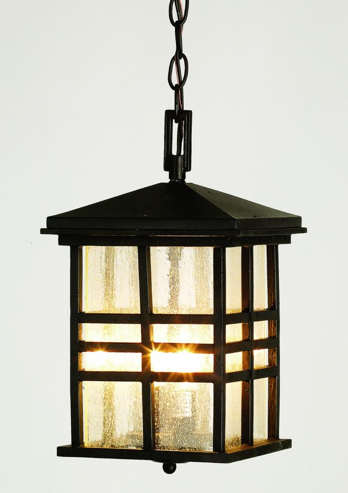 The Huntington Collection brings suspended decor to an outdoor area with a hanging lantern. The Huntington 15.5" Hanging Lantern brings unobtrusive lighting to any outdoor living area while boasting an eye-catching design. An elegant finish, classic lines, Seeded Glass and enduring style encompass the Huntington collection. This Mission/Craftsman style fixture features 8 windows on each side. The Huntington Collection is a complete outdoor offering of styles to suit your landscape needs. A matching chain is included with this fixture for hanging.