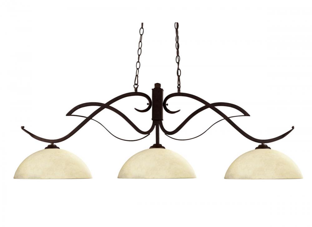 Bold flowing curves define this three light fixture. Finished in bronze, this fixture uses dome golden mottle glass shades to create a contemporary, yet classic look. This fixture includes 72?? of chain on both sides to ensure a perfect hanging height.