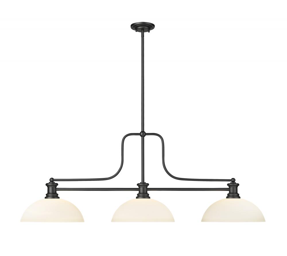 Signature details highlight the expert design and craftsmanship of a three-light linear billiards pendant. Matte opal glass dome shades cast a warm and welcoming glow over a kitchen island or game table, and offering a classic complement to matte black finish metal framing.