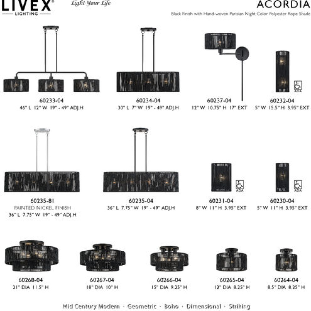 What a joy to come home to the calming, balanced and stylish Acordia lighting collection, with its semi-transparent texture and dynamic illumination! This midcentury modern lineup of elegant ceiling and wall lights features minimal metal frames with dimensional drum-shaped, tiered shades – masterfully handwoven with silky-smooth, highly-durable polyester rope, finished in noble, natural and atmospheric colors.