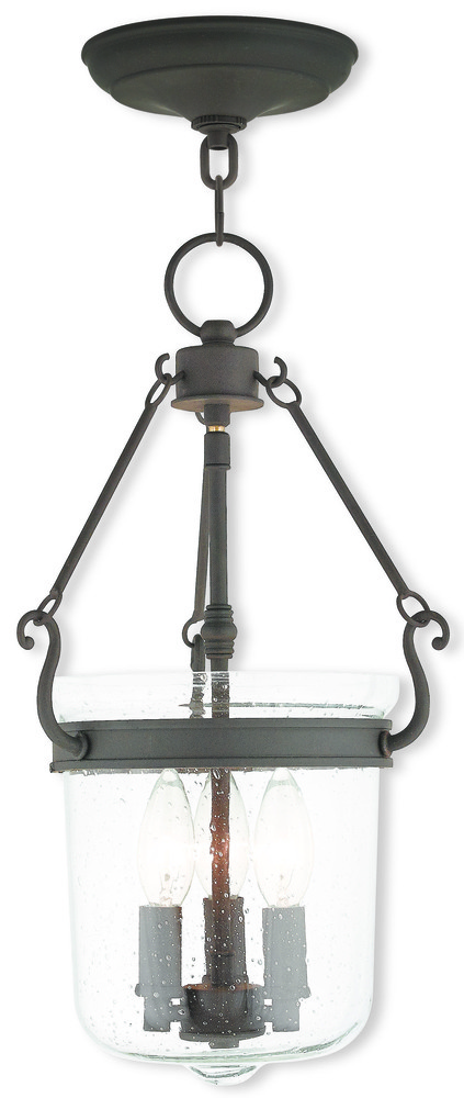 A hand crafted seeded glass holds three candelabra bulbs in this wonderful chain hung bell jar lantern. Bronze finish adorns the hardware and round canopy.