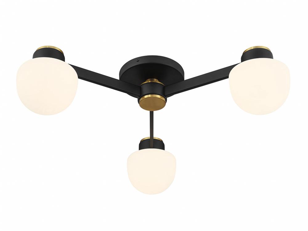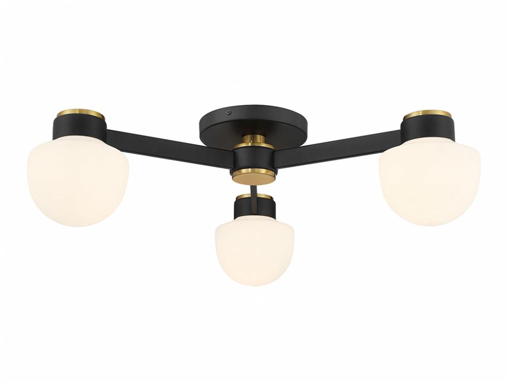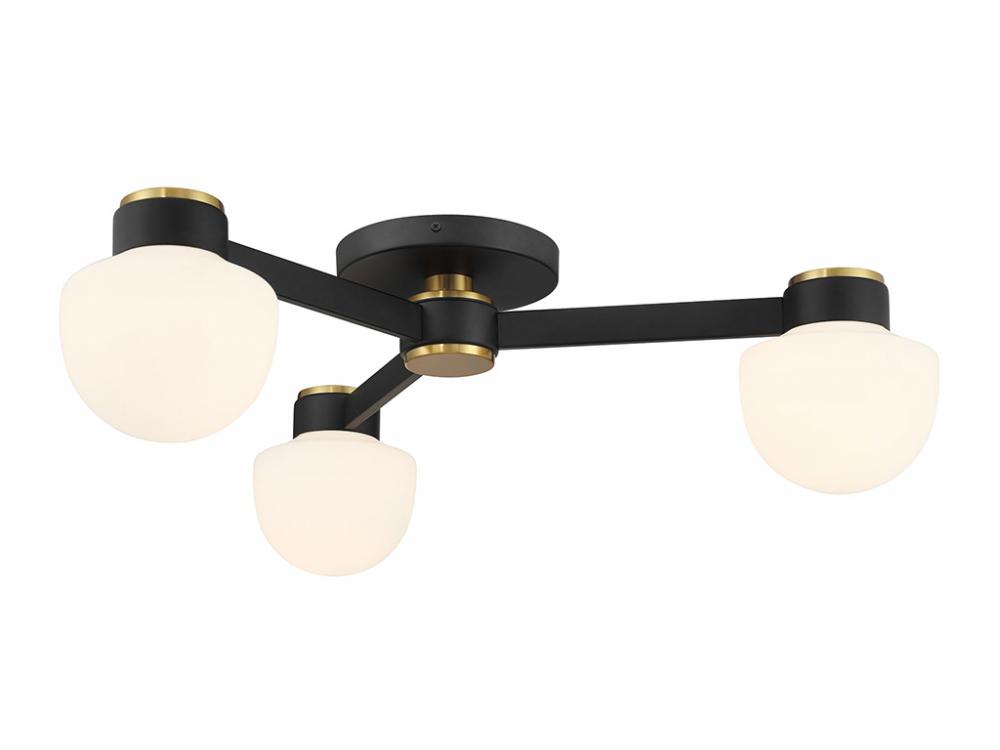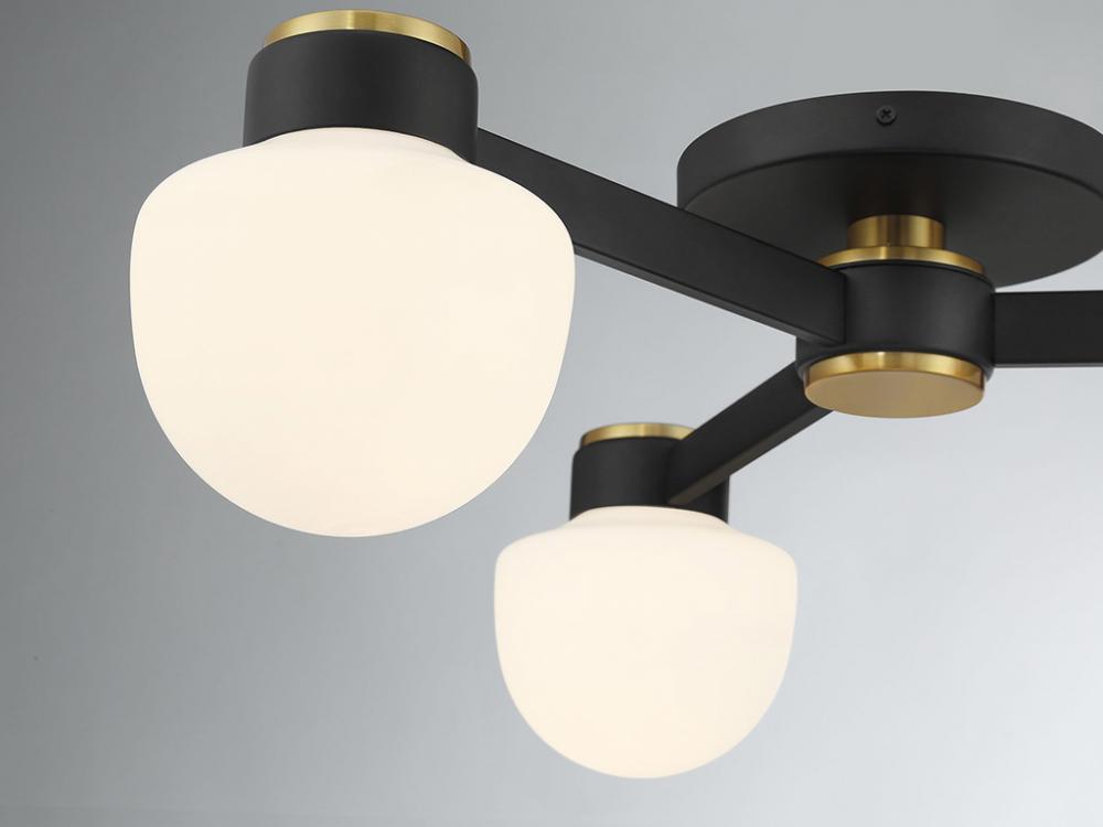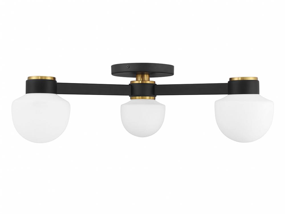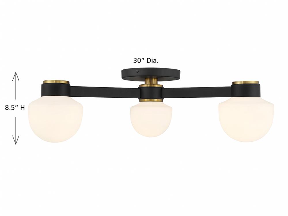 Give any room a boost of brightness with this 3-light semi-flush mount. It showcases a spectacular mid-century modern style with rounded shades of white opal glass. The finish combines Matte Black with Natural Brass accents for a timeless two-tone touch. 8.5" height, 30" width. Uses 3 candelabra size bulbs of up to 60 watts per bulb. Bulbs not included.