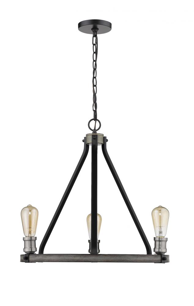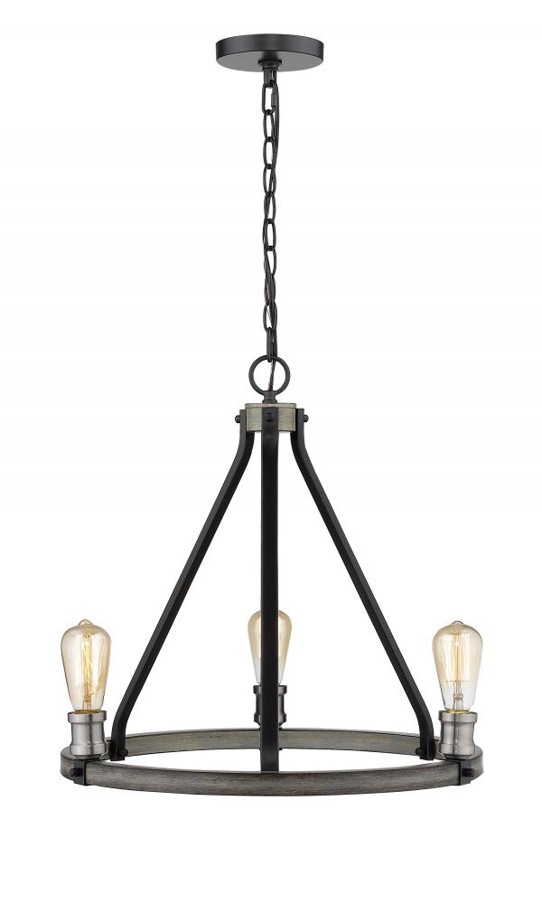 Open and airy, this three-light faux barnwood chandelier is the epitome of modern design. Intermingle the romance of exposed lightbulbs and the distressed industrial feel of the ashen finish.