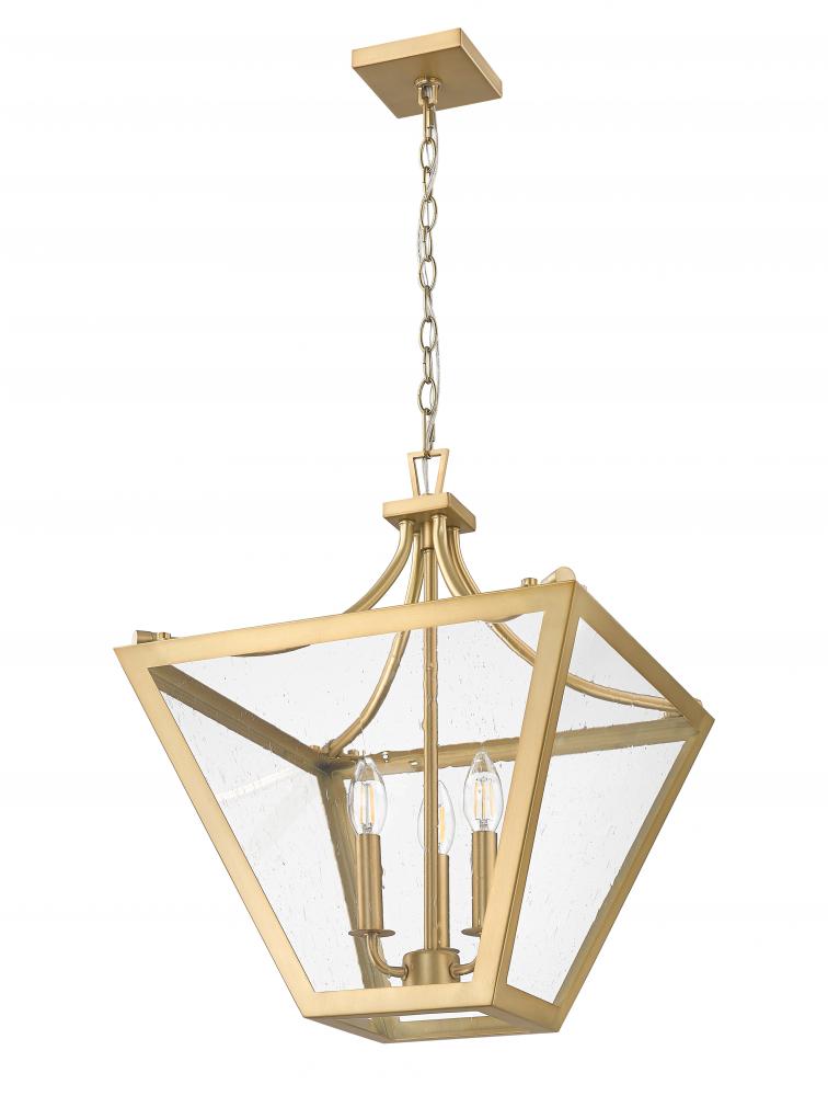 Illuminate any setting with this uniquely shaped three-light chandelier made of rubbed brass finish steel with glass panels. Extra detailing accents a chic fixture that makes a design statement in living rooms, dining rooms, and foyers. With dimmable lighting infused through interior candelabra bulb mounts, this light fixture becomes a statement piece.