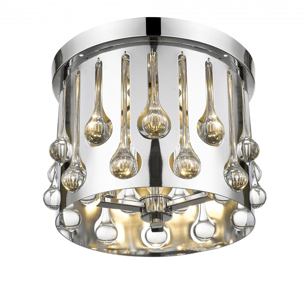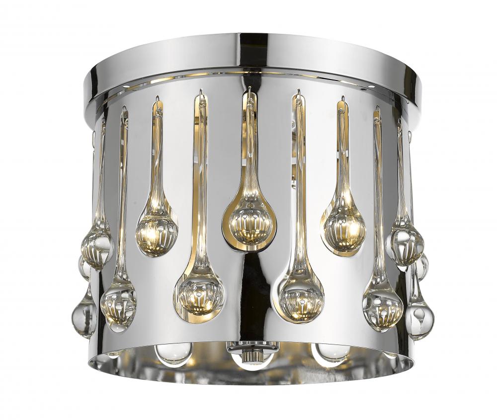 Elegant d?cor works from floor to ceiling, and this three-light flush mount fixture offers a prime example. Enjoy the fresh contemporary ambiance of shiny chrome finish steel dotted with droplets of crystal glass, and place it in a low-ceiling environment for an optimal effect.