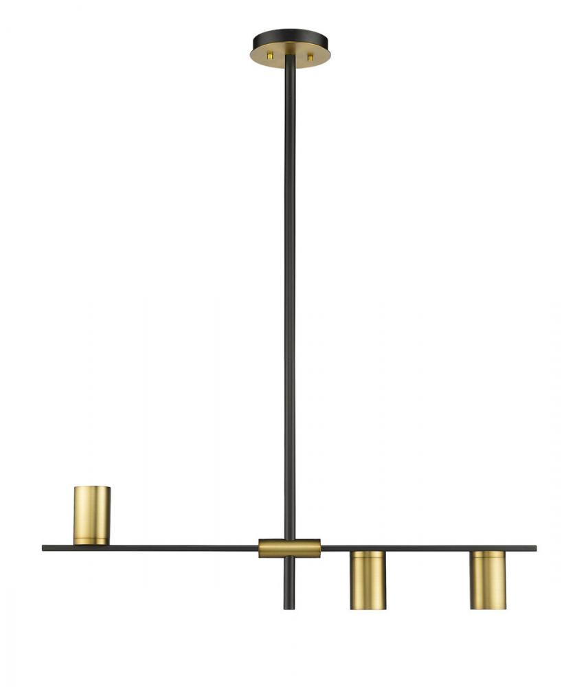 Turn conventional d?cor on its head with a storied Native American theme worked into a transitional light fixture meant for entertaining spaces. This three-light island and billiard light from the Calumet collection reflects primitive styling that blends matte black finish steel in a linear frame, arm, and canopy with carefully arranged olde brass finish steel shades. Enjoy uplighting and downlighting with a light fixture that offers dynamic personality.
