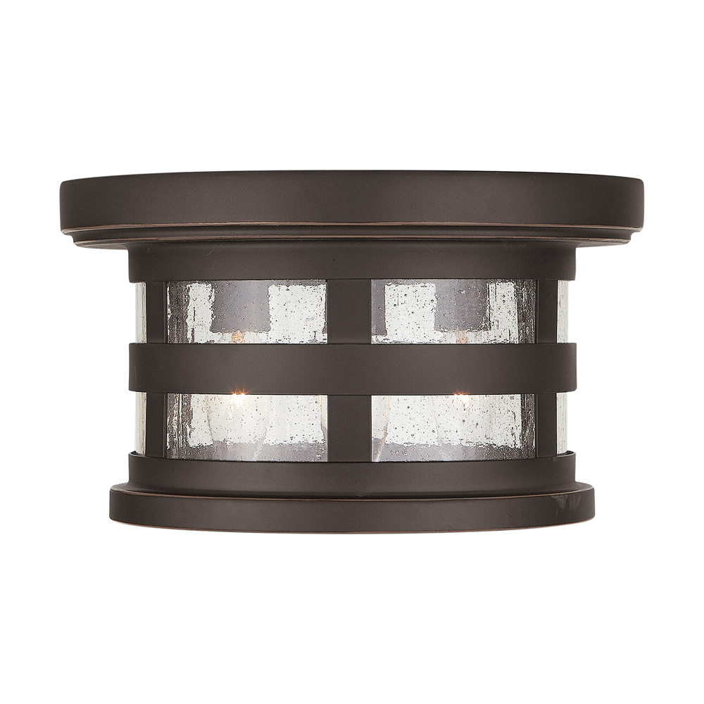 3 light outdoor flush mount with Oiled Bronze finish and Antiqued Seeded glass. "Rain or Shine" 5 year warranty protection against rusting or fading.