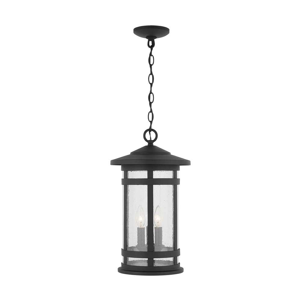 3 light outdoor hanging lantern with Black finish and Antiqued Seeded glass. "Rain or Shine" 5 year warranty protection against rusting or fading.