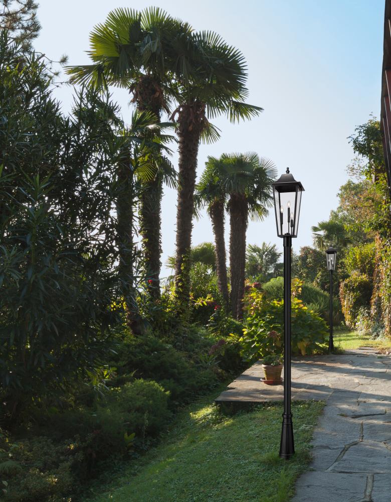 Crisp and clean in profile, elongated lines add updated allure to this traditional three-light outdoor post light. Its classic lantern profile is defined with a durable Coastal black finish, with beveled glass panels that add richness and depth. Its the perfect choice for a front walk, adding curb appeal to your home.