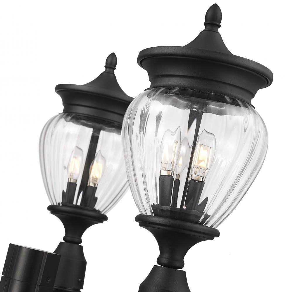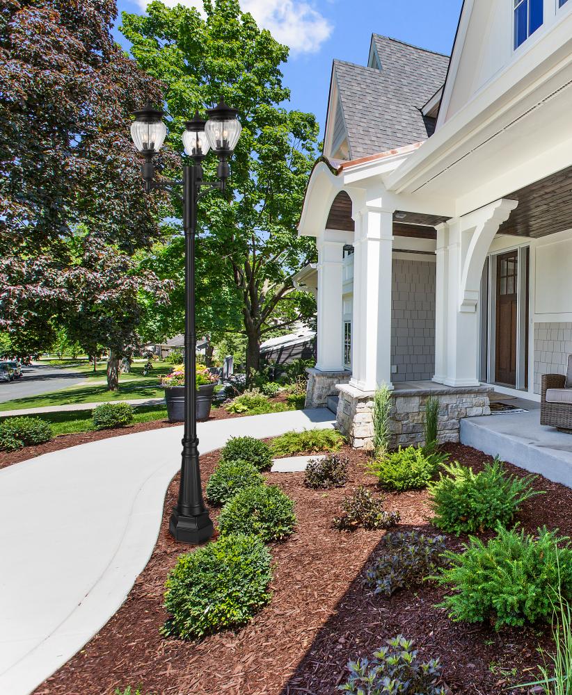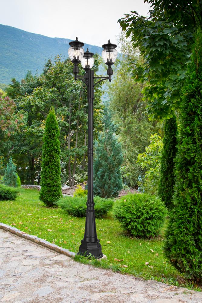 Teardrop glass shades create a unique look and feel for this charming three-light outdoor post-mounted fixture. Each of nine lights casts bright ambient illumination, perfect for strolls on garden paths and setting an inviting first impression on your front walk. A black finish is stylish and versatile, complementing your exterior to perfection.