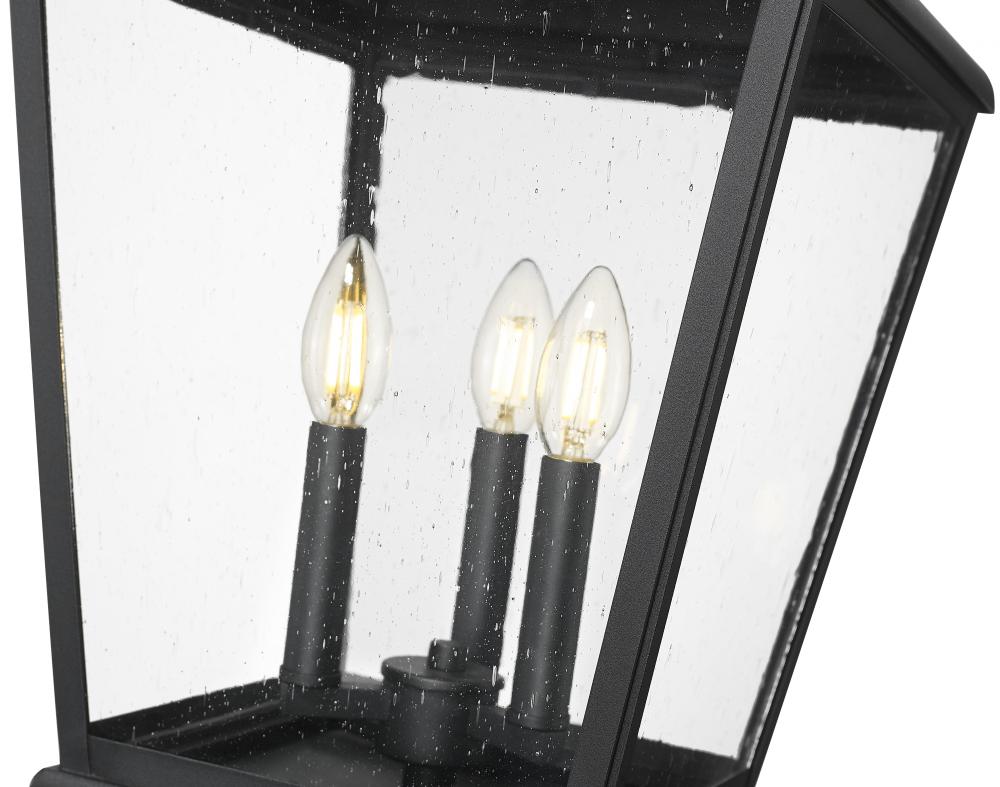 A village motif delivers romance and elegance to this three-light outdoor post mount fixture making a statement in front yard spaces and walkways. Aluminum construction of a lantern-like frame is coated with soft sand black finish, with clear seedy glass panels embellishing its mystical aesthetic. Interior candelabra bulb mounts and dimmable lighting put finishing touches on a decorative light fixture.