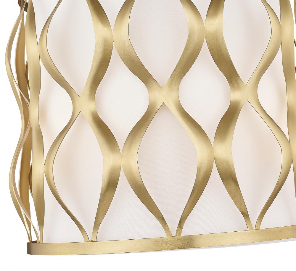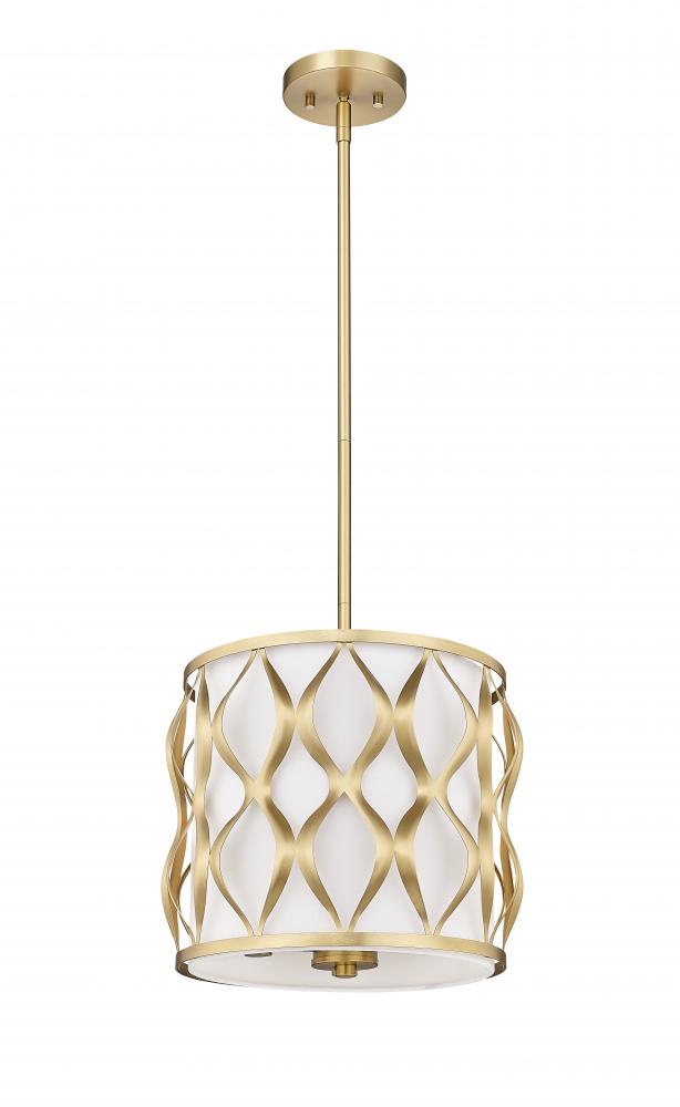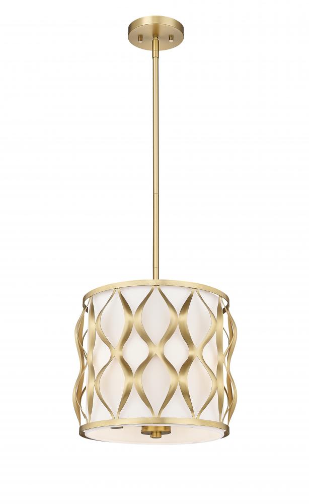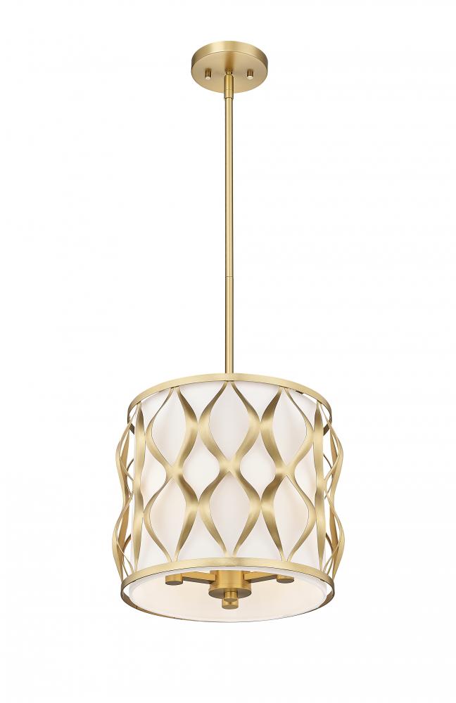 Embrace the timeless design bridging industrial and modern style motifs with a three-light pendant with a clean modern gold finish over steel framing. A drum silhouette is aesthetically pleasing as this fixture offers artisan ribbon waves cascading vertically down its banded frame, and a soft white fabric diffuser maintains pleasing lighting effects. Candelabra-style lights and a round canopy complete a checklist of features that round out an iconic look in a pendant that adds elegance to kitchens, foyers, and dining spaces.