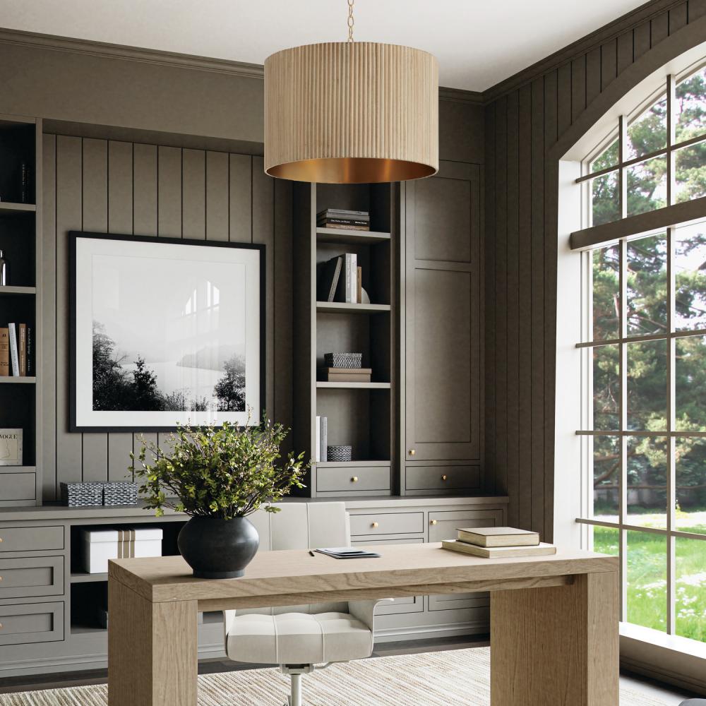 Artisan texture meets mid-century modern style in the Donovan Pendant. The White Wash fluted mango wood shade evokes a natural elegance, while the Matte Brass interior adds a warm glow.