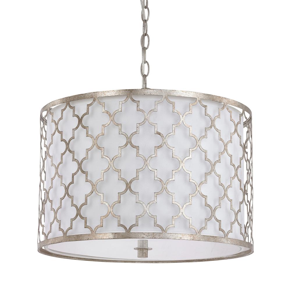 Our Ellis 3-light pendant gives you all the options in chic style. Covered in a quatrefoil-patterned framework in our shimmering Antique Silver finish, the drum-style fabric shade has a frosted glass diffuser with finial for a soft glow. The pendant includes chain and semi-flush mount options to perfectly fit a variety of spaces, and is also available in our Brushed Gold and Capital Gold finishes.