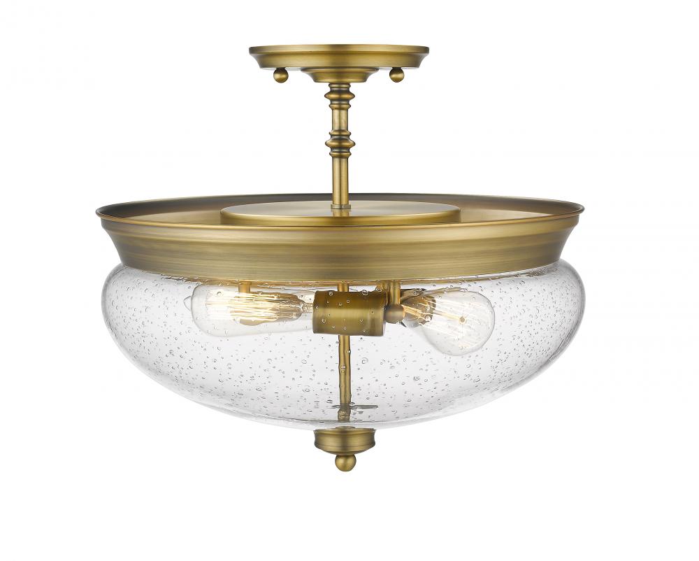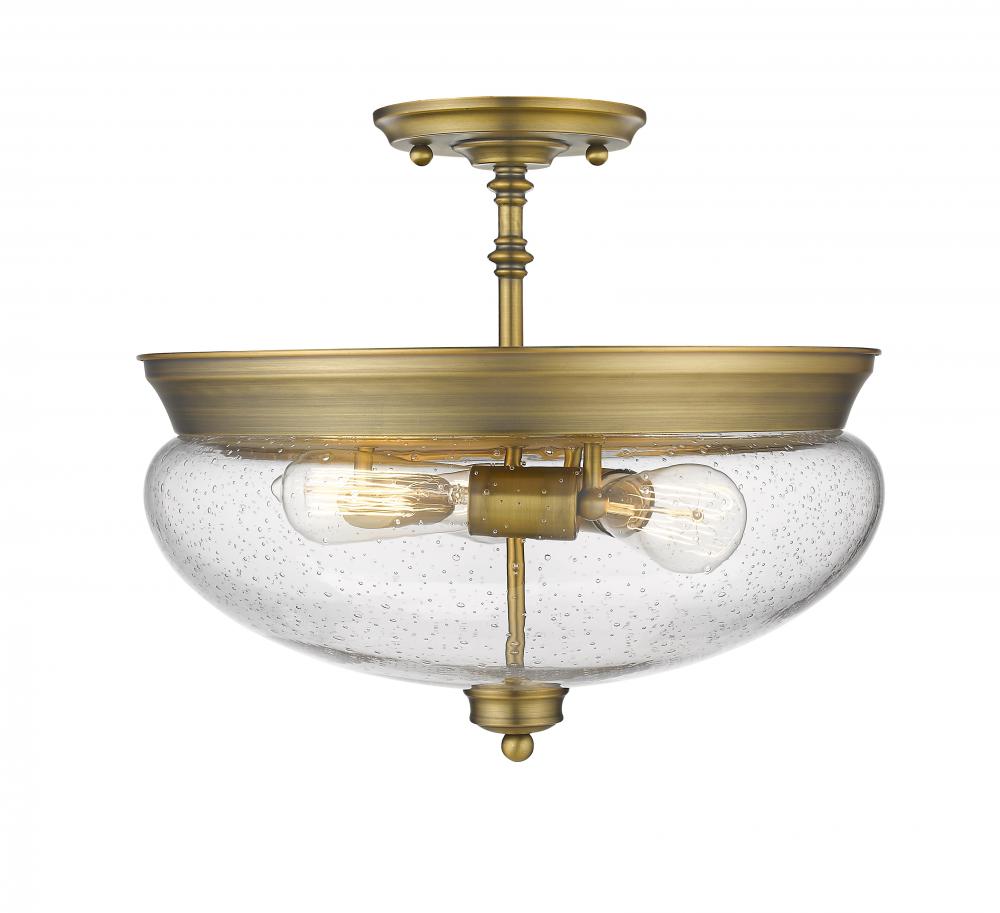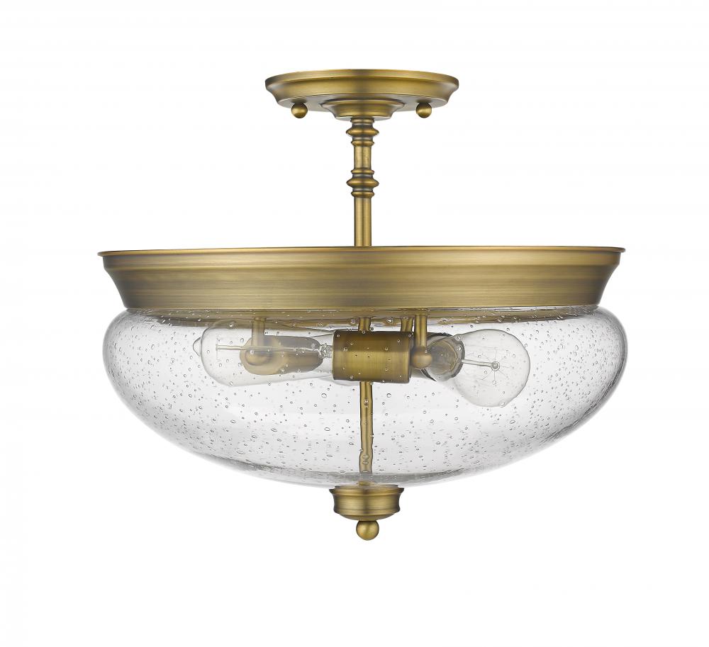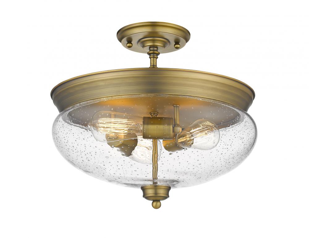 A vintage sense of agelessness permeates chic fresh lines in this three-light semi flush mount lighting fixture. The clear seedy steampunk inspired globes give a rustic appeal while the delightful heritage brass underscores a classic look.