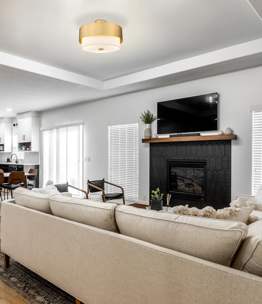 A stylish mix of Mid-Century Modern and industrial ambiance speaks to versatility and an easy, laid-back look with a light fixture that defines basic yet elegant simplicity. Embrace the modern gold finish metal framing and white fabric shade of this semi-flush mount ceiling light from the Counterpoint collection that brings a kick to a contemporary or transitional space. Ideal for dining rooms, living areas, and foyers, this circular semi-flush mount light invites an equally expressive design scheme.