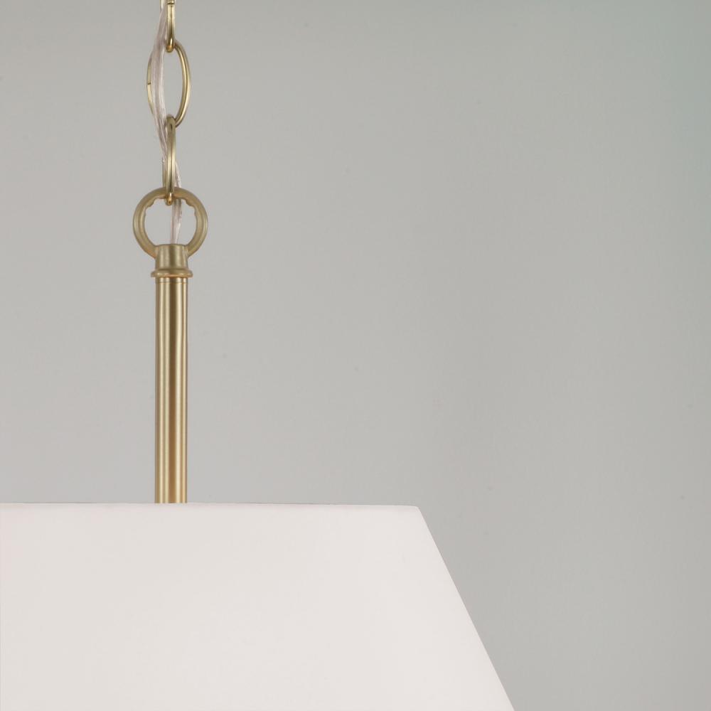 Transitional style meets modern details in the Parson Dual Mount Pendant. Whether hung as a pendant or a semi-flush, the tailored white fabric shade complete with a glass diffuser creates a soft glow and sophisticated aesthetic alongside the Matte Brass finish.