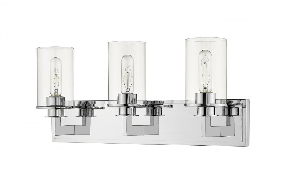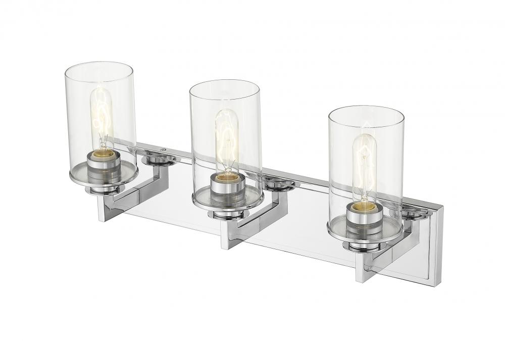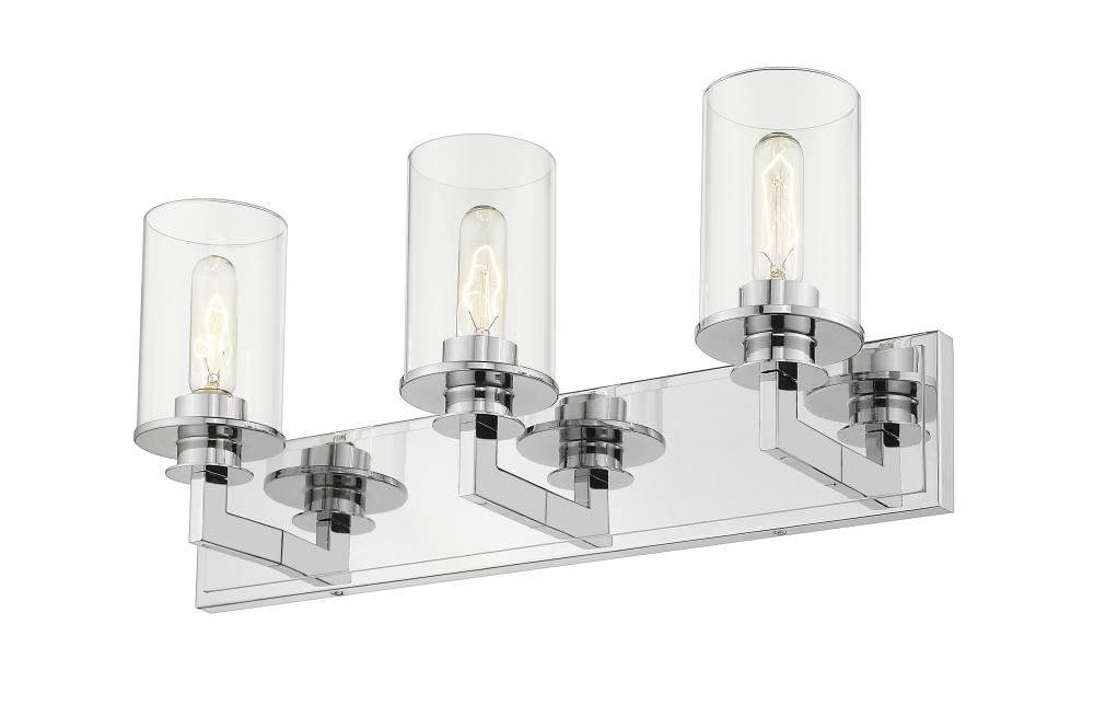 Audaciously stylish with slim angled lines, this mid-century modern three-light vanity is the epitome of elegance. A shiny chrome finish underscores the stunning brightness of the clear glass cylinder-shaped shades.