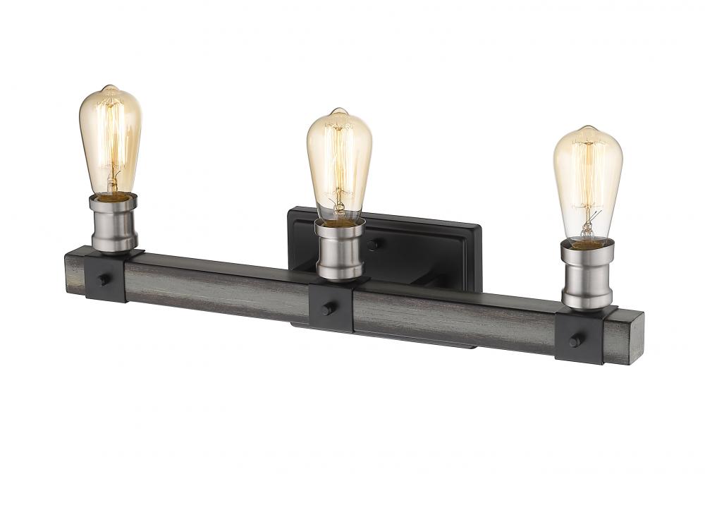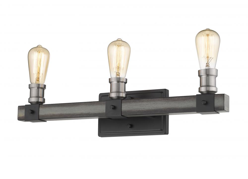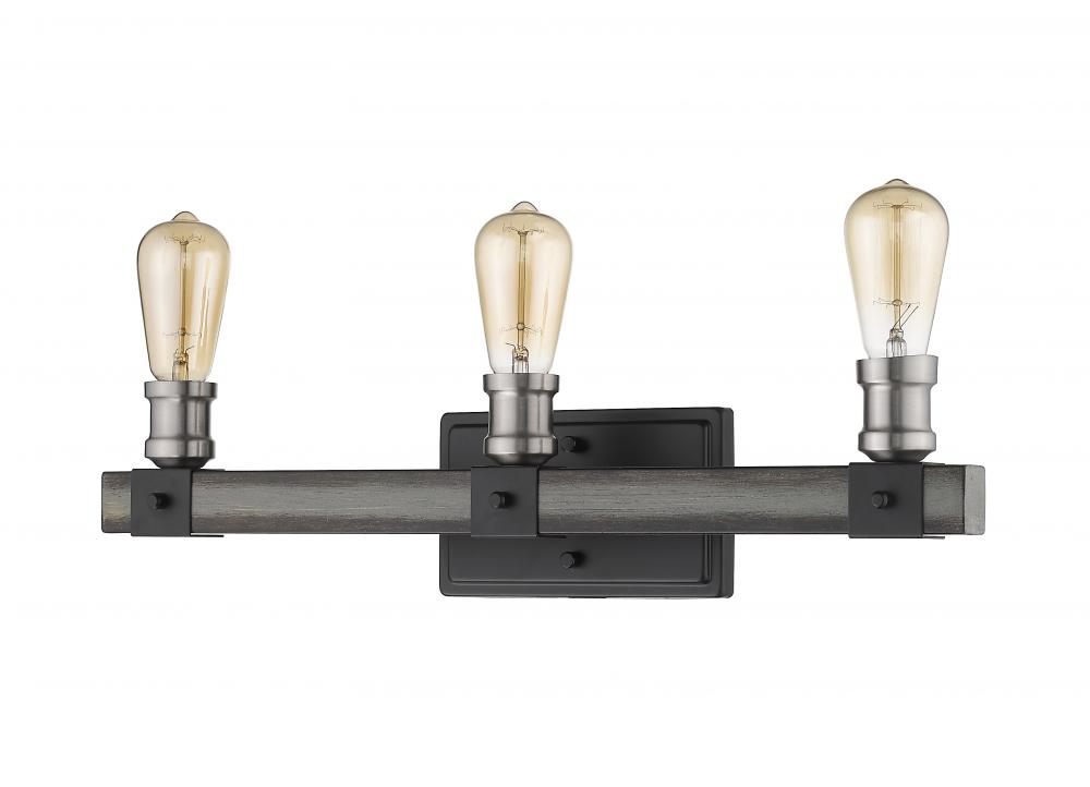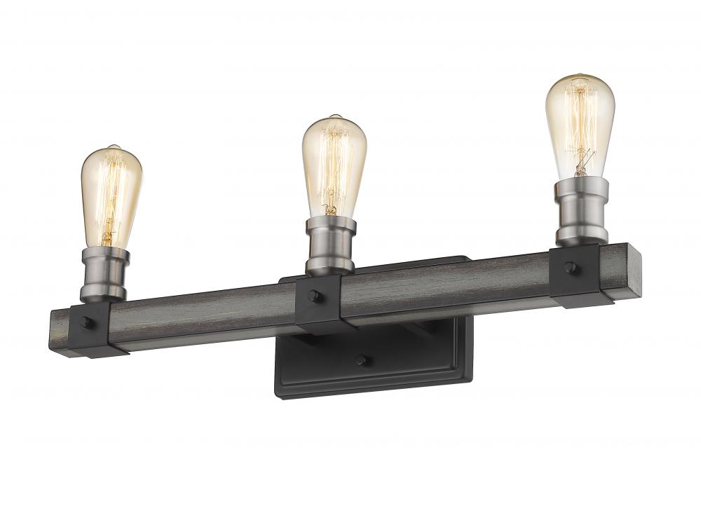 Bright and brilliant, this three-light wall sconce shines sleek industrialism over a bathroom vanity. Constructed of faux barnwood, the clean lines of the silhouette boast a rugged ashen hue thats energized by the glow of exposed lightbulbs.