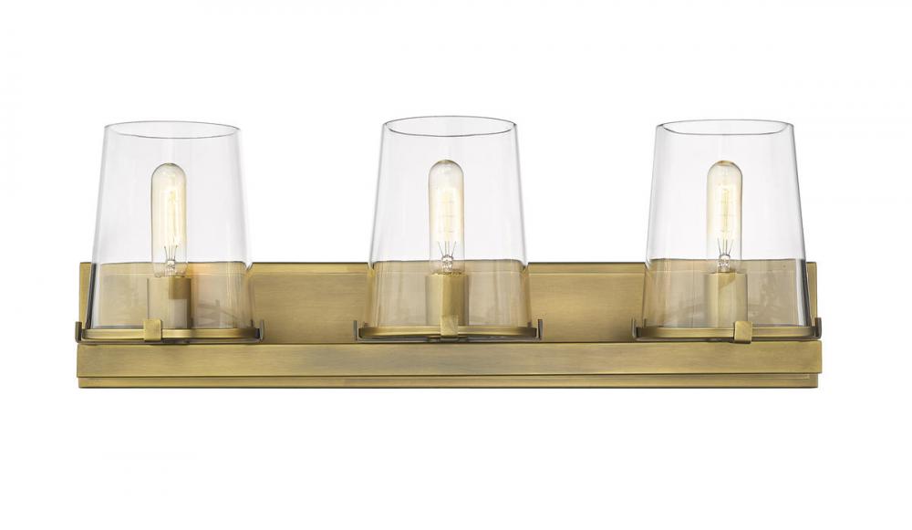 Showcasing a rich, rubbed brass finish, this metal vanity light makes a stylish impression in a modern powder room. Three tapered, clear glass shades complete the design in effortlessly elegant style.