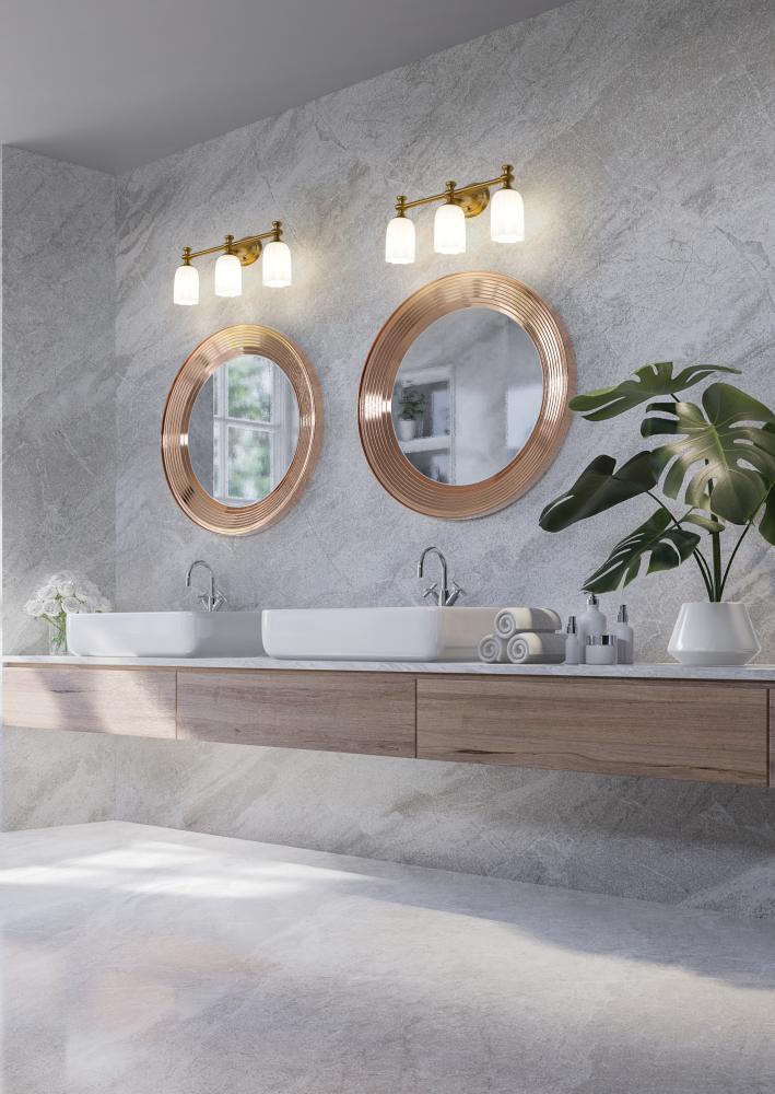 The Orion vanity series is enhanced by a flourish at the top of each frosted glass shade that brings a delicate design sensibility. Orion can be ordered in a choice of Brushed Nickel, Matte Black, Chrome, and Modern Gold finishes.