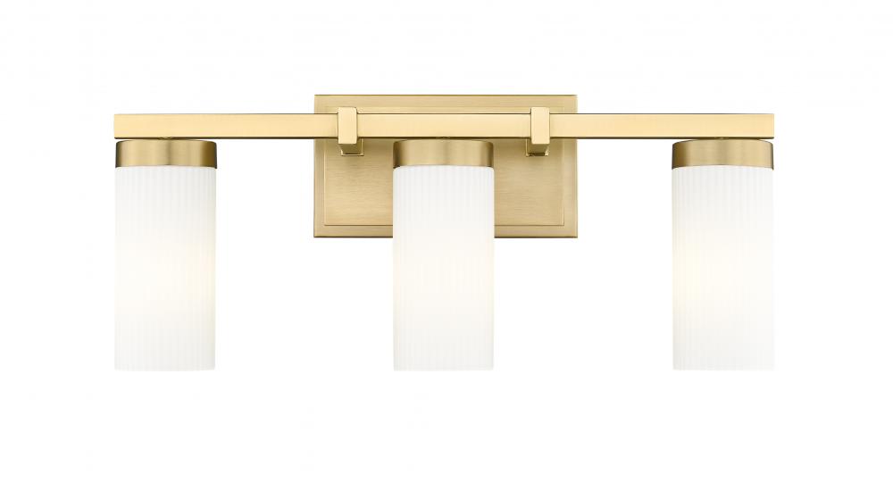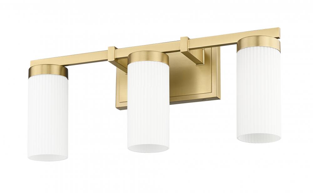 Clean, classic design sets the tone for a modern three-light vanity fixture. Its modern gold finish is rich and warm, adding character. A trio of frosted white glass cylinders shade the lights, creating diffused illumination for ambiance and daily grooming tasks.