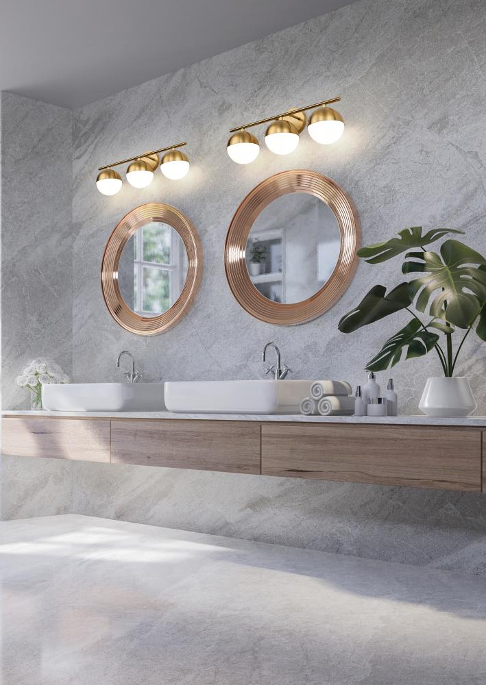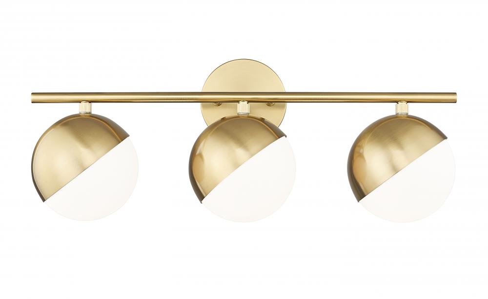Create the perfect look for your primary or guest bath with a mid-century three-light vanity bath light. It delivers rich warmth with a modern gold finish, and includes three orb shades of matte opal glass for soft, inviting illumination. Its a stunning choice over your vanity, perfect for a sophisticated ambiance.