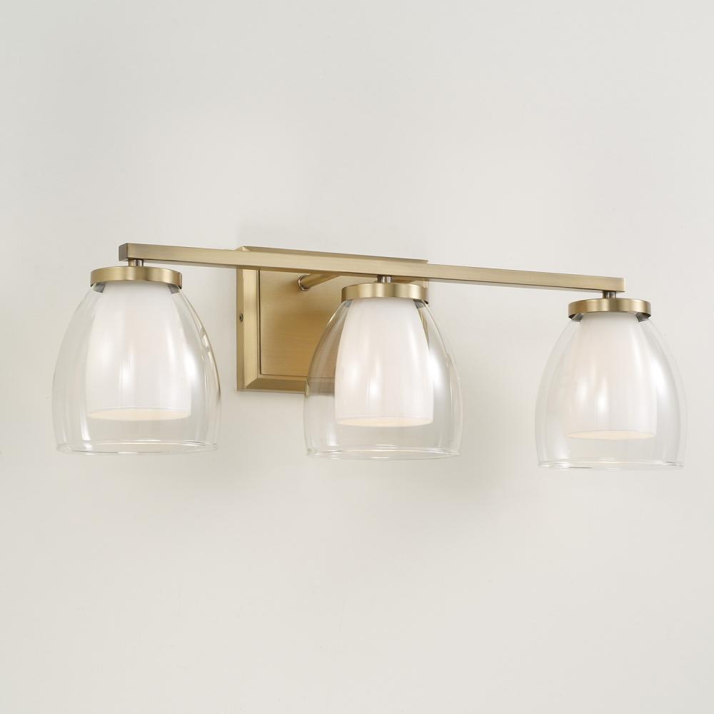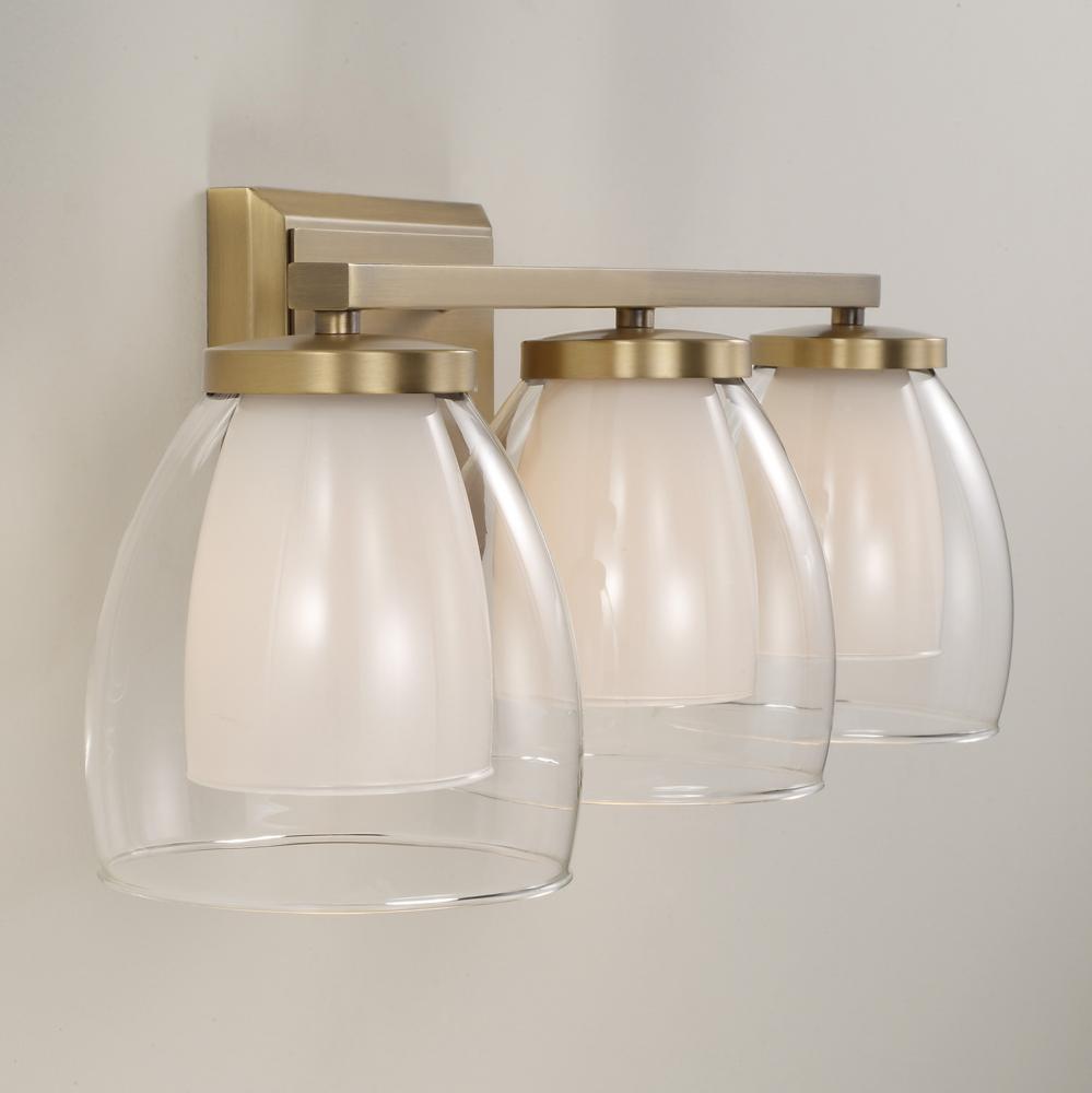 Chic curves and stunning details create the Joss Vanity. The layered Soft White and Clear glass delivers glamorous dimension, while the Aged Brass finish adds visual warmth to the sleek lines for an all-around captivating luminaire.