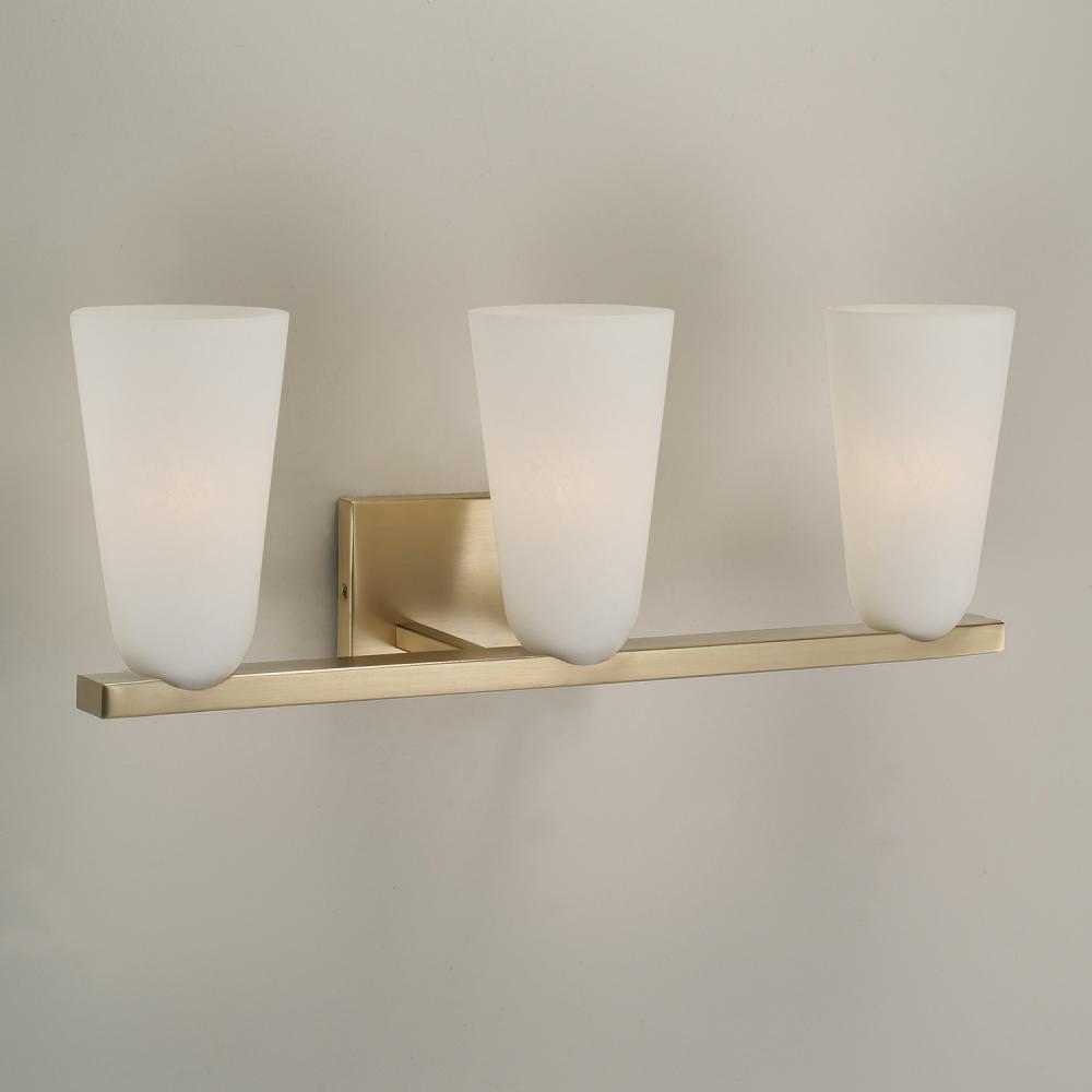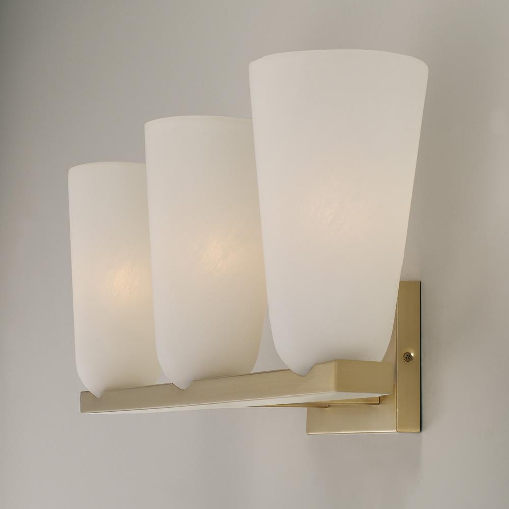 The Romy Vanity delivers transitional style with modern appeal. In elongated tapered shades curved at the base, the Faux Alabaster glass gives a soft ambient glow. Finished in Matte Brass, this luminaire brings effortless sophistication to any bathroom.