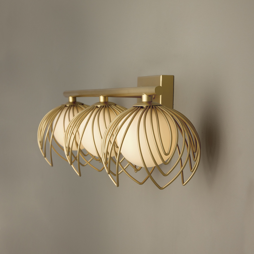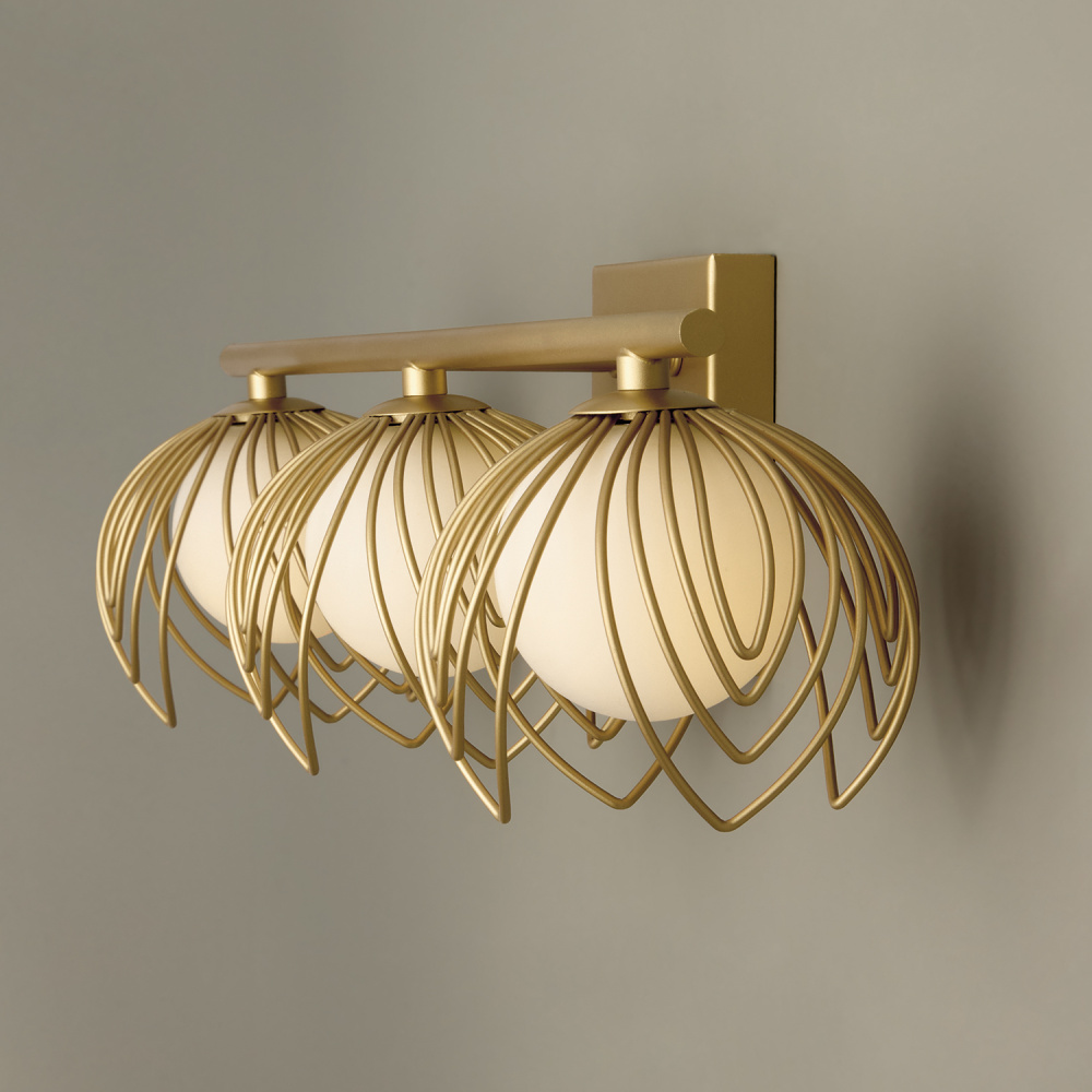 Romantic and artful, the Flora 3-Light Vanity exudes botanical charm in powder room settings. Soft White glass globes are surrounded by a floral motif of delicate bent wire petals, finished in our signature Buffed Gold to bring a vibrant, warm hue to this showstopping style. Also available in a 2-Light.
