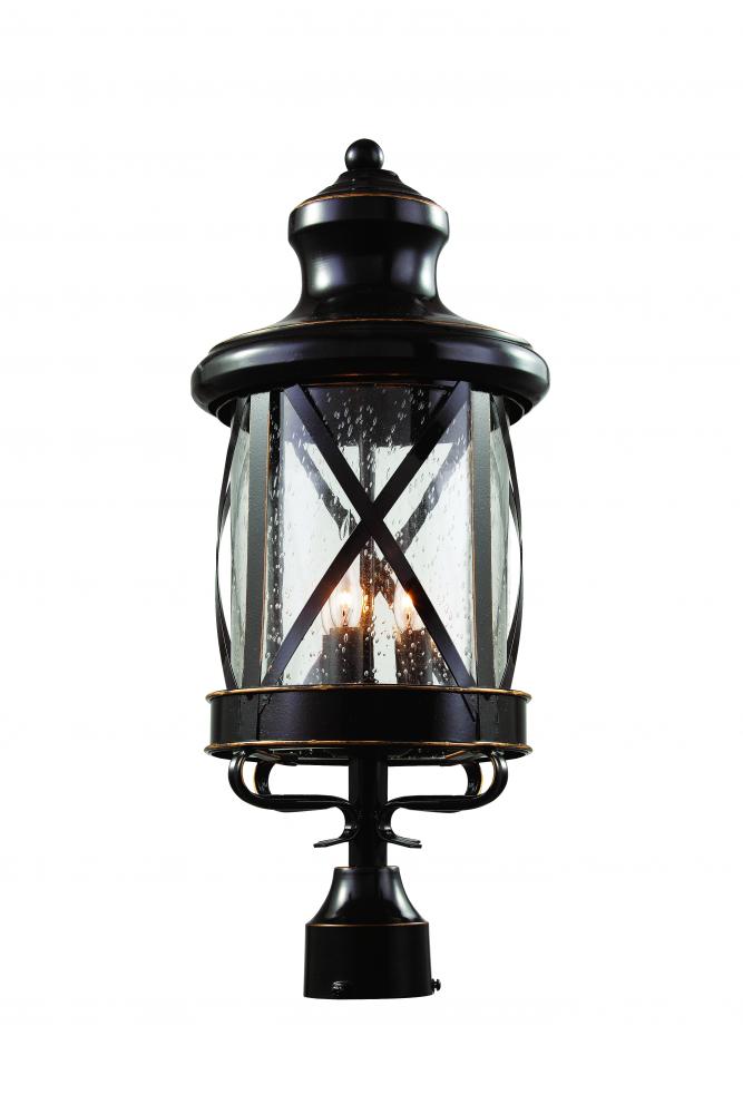 The Chandler 21.75" Postmount Lantern adds charming character to your home’s exterior. The postmount lantern sets a warm and inviting tone for an outdoor living area while providing ample lighting. The Chandler 21.75" Postmount Lantern is a three-light fixture with a clear Seeded Glass shade that creates soft reflections across the landscape. A cross bar trim over the glass shade adds rustic appeal. The Chandler Collection is finished in Rubbed Oil Bronze.