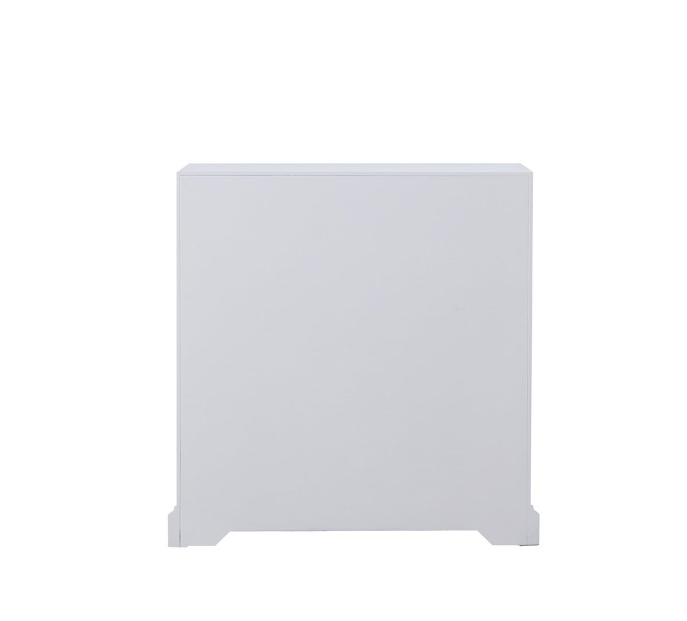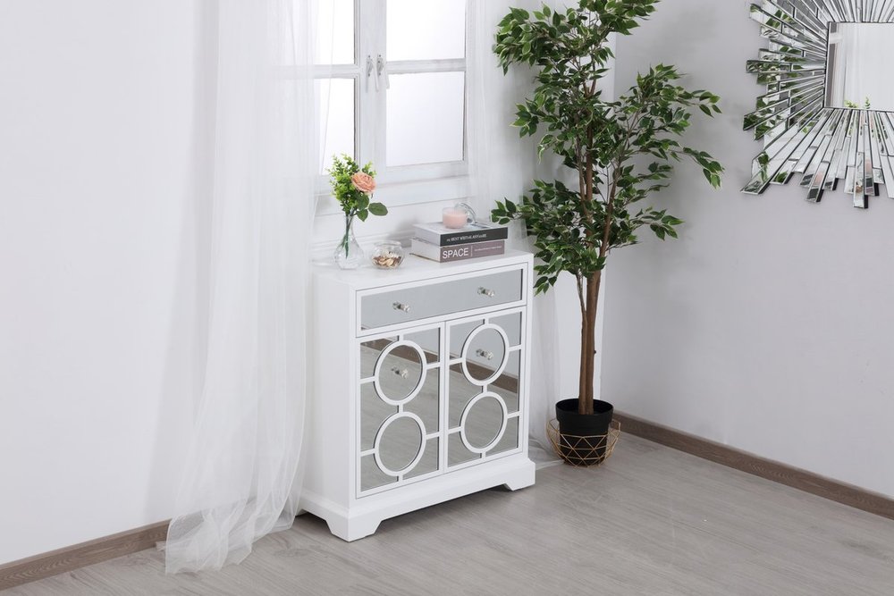Add a touch of class to any room with this stunning accent chest. Hand painted in white with beaming mirrored surfaces and circle overlay, it opens up the visual space in the room while imbuing it with glamour. This functional transitional chest comes with one drawer, two doors, sparkling crystal knobs, on solid tapered tapered legs.