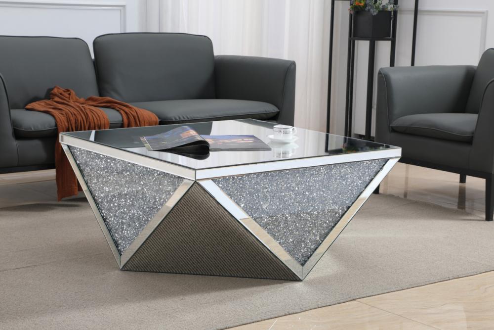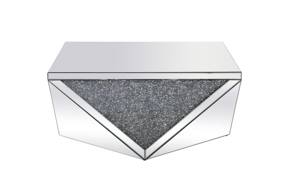 Make a striking statement with this polygon shaped end table. Panels of triangles are decorated with glittering gray crystals embellishing clear glass. These sparkling gray crystals both compliment and complement the polished clear beveled mirror panels that border and decorate the rest of the décor. Its shining and reflective beauty will add modern elegance and contemporary style to any space. Adorn it with your favorite objects—captivating art pieces, beautiful floral arrangements, or even personal treasures like family portraits—and put them center stage for all to see.