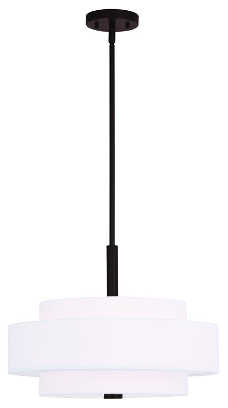 A Triple Drum Shade Adds Character To This Handsomely Styled Pendant Light. Update Your Decor With The Clean Styling Of This Contemporary Four Light Pendant From The Meridian Collection. Features A Lovely Hand Crafted Off White Fabric Hardback Shade And Frosted Diffuser For Subtle Illumination.