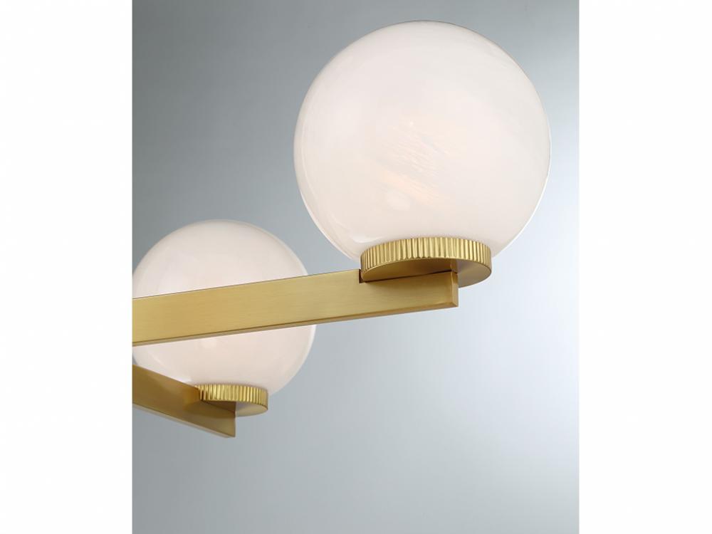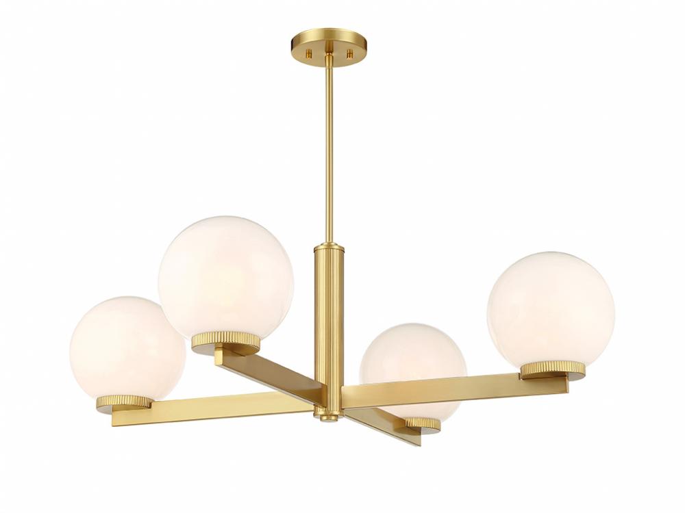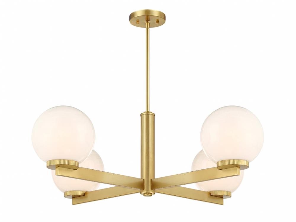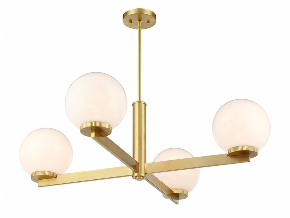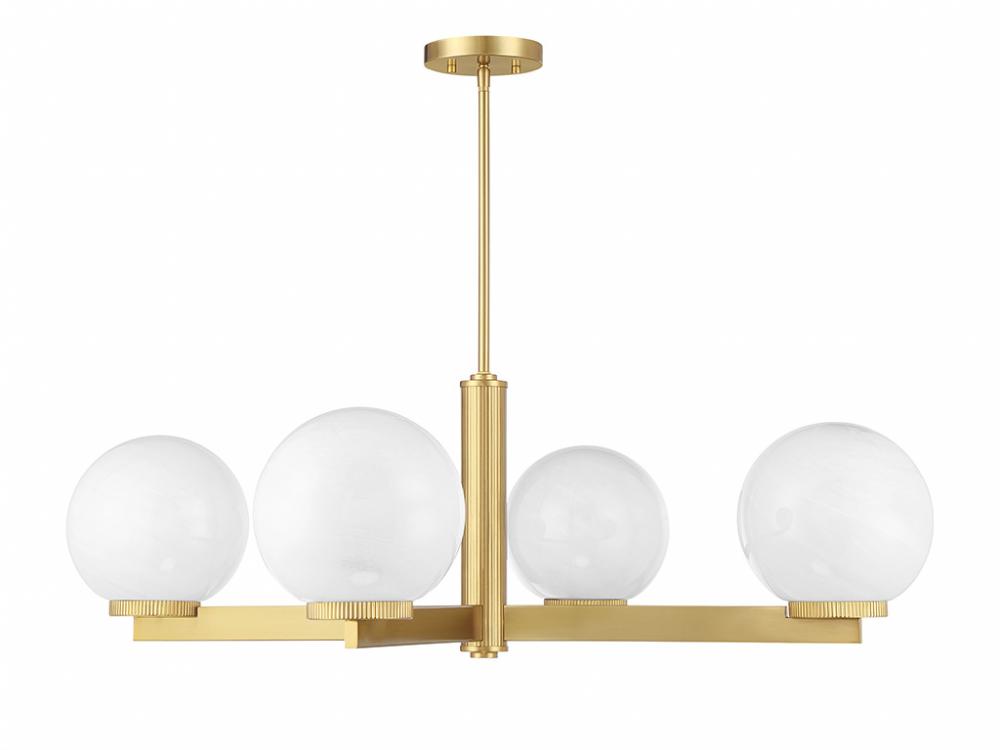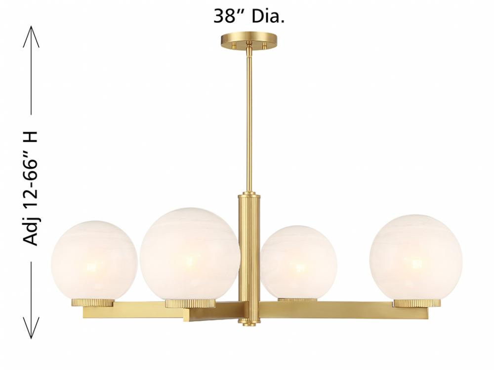 This 4-light chandelier flaunts a fabulously Art Deco look. Each slim, straight arm is topped with an orb of strie glass featuring dazzling swirls that draw the eye, soften the glow and work beautifully with the Natural Brass finish. Knurled detailing below each glass shade adds an extra touch of style. This chandelier is 38" in width and has an adjustable height ranging from 12" to 66". Comes with four 12" downrods and one 6" downrod. Uses 4 standard size bulbs of up to 60 watts per bulb. Bulbs not included.